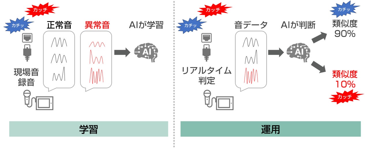 正常音と異常音を学習したAIが、今鳴った音が学習した音にどれほど近いのか高速判定します。