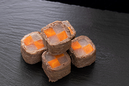 下茹でした大根と人参をスライスした和牛モモ肉で巻き上げ、コンソメスープで煮込んだ上品な逸品。