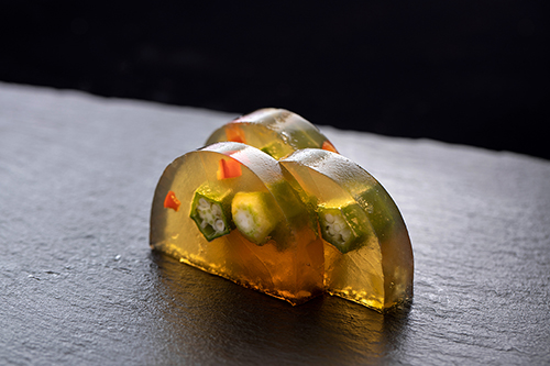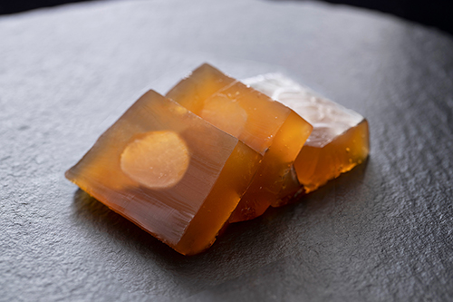 牛骨、牛すじ、赤身肉と数種類の野菜を3日間炊き込んだ、琥珀色のコンソメスープをゼリーで固めました。