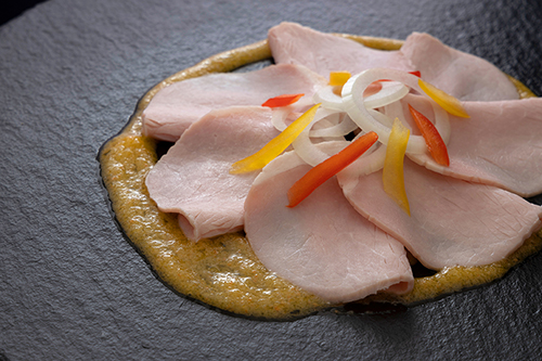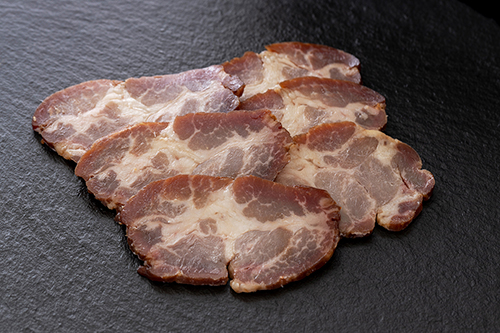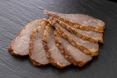 希少価値の高い氷室豚の肩ロースを、砂糖、醤油、酒、生姜、りんごを合わせた調味液に一週間漬け込み炭火でじっくりと焼き上げた逸品です。