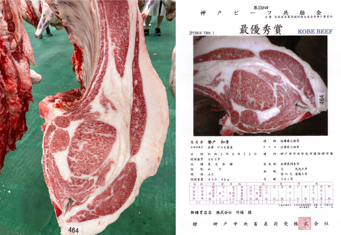 厳格な審査基準をクリアし、品質において他の高級牛と比べ群を抜く『神戸ビーフ』。今回竹福は、神戸ビーフだけが競う「第338回神戸ビーフ品評会」で最優秀賞を受賞した牛、いわゆる「チャンピオン牛」を購入しました。