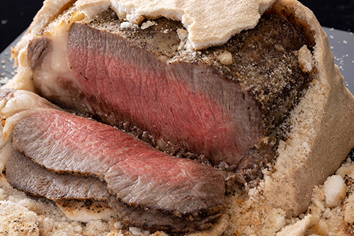 塩釜焼は、お肉を塩で包んで焼き上げる事で旨味を逃がさず和牛本来の美味しさを最大限に引き出します。