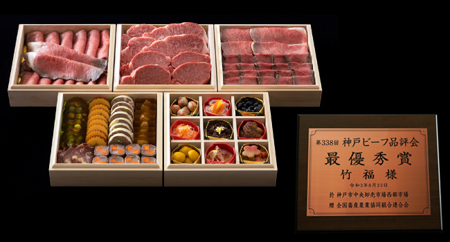 最高峰の神戸ビーフチャンピオン牛で、お肉を知り尽くす竹福が挑んだ肉おせち。2022年おせち史上、『日本一の肉おせち』であることは間違いありません。