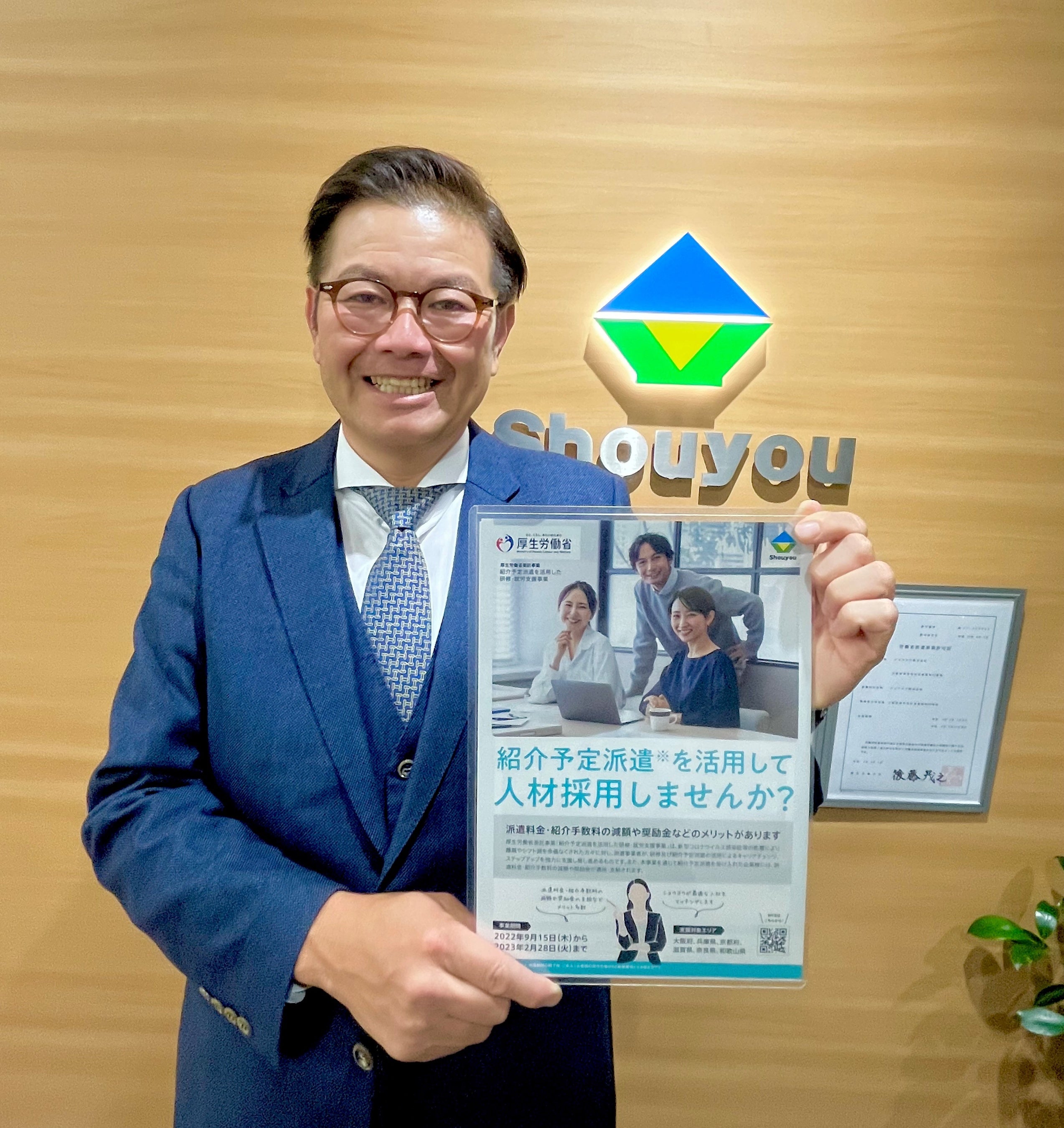 厚生労働省の優良派遣事業者認定を受けているショウヨウ株式会社(本社:大阪府堺市、代表取締役:河野尚樹)は、厚生労働省「紹介予定派遣を活用した研修・就労支援事業」の委託事業者に選定されました。