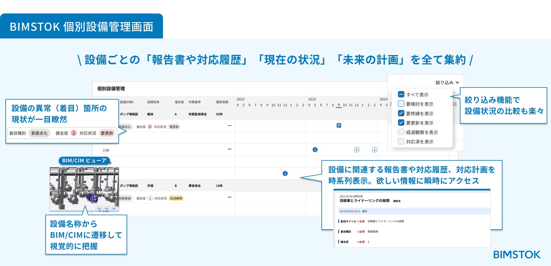 BIMSTOKは、BIM/CIMを活用し、維持管理情報を一元的に管理できる維持管理システムです。維持管理情報が設備ごとに時系列で整理され、必要な情報へ瞬時にアクセス可能。設備の経時変化を分かりやすく可視化し、施設管理者の意思決定を支援します。