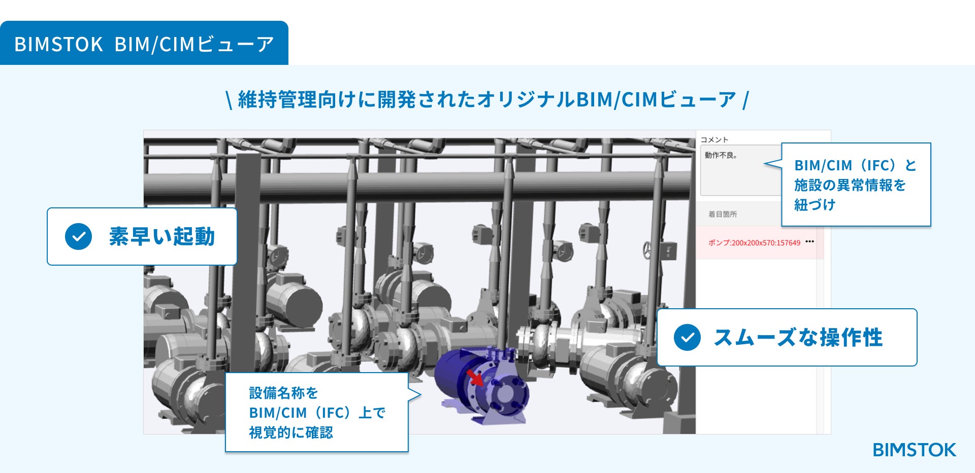 BIMSTOKは、施設管理者向けBIM/CIMビューアを備え、維持管理に特化したBIM/CIMソフトウェアです。BIM/CIMと設備情報や、設備に紐づく各種報告書等の維持管理情報を連携し、直観的な施設構造の把握だけでなく、設計段階からの情報の蓄積と維持管理情報の共有における効率化を図ります。