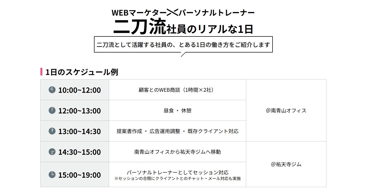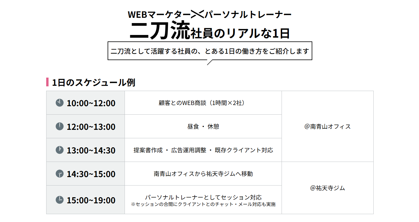 二刀流採用は、Webマーケターとパーソナルトレーナーの2つの仕事を同時に行うキャリアモデルです。
