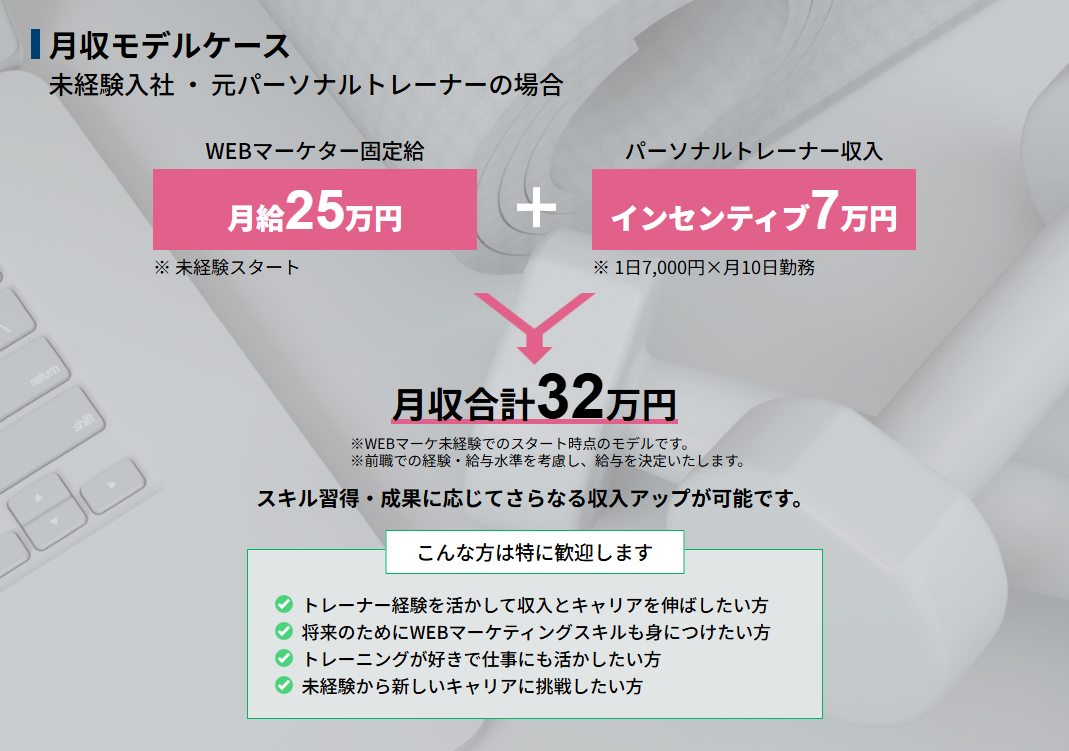 このように、Webマーケティングのキャリアを築きながら、トレーナーとしての収入も得られる「二刀流の働き方」を実現できます。