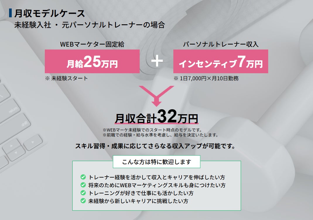 本制度は、キャリア形成(Webマーケター)と収入確保(パーソナルトレーナー)を同時に実現する新しい採用モデルです。