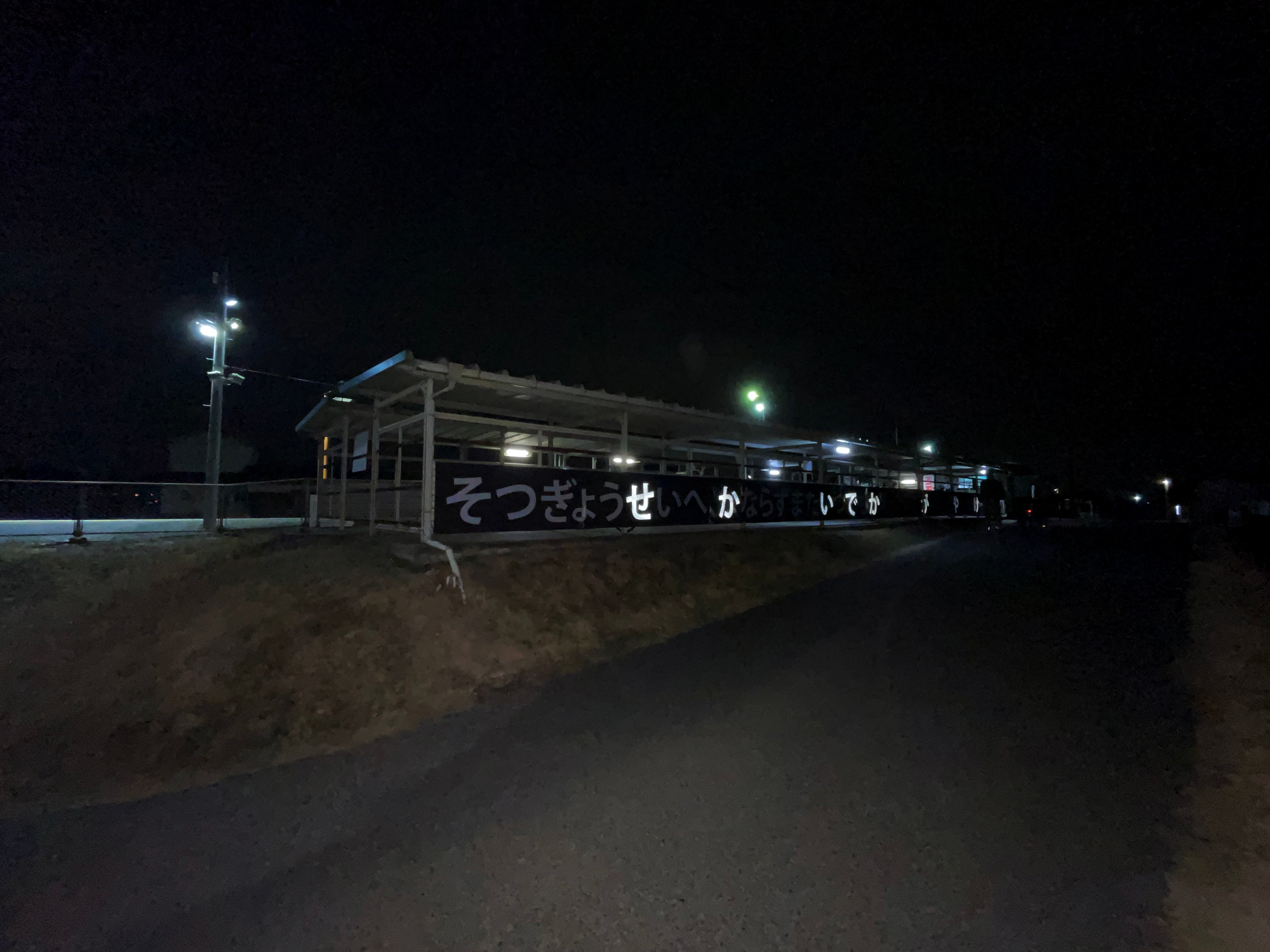 3月18日から25日までの期間、岡山県立大学の最寄り駅であるJR服部駅の自転車置き場北側壁面スペースに、今年3月で卒業する学生へ贈る卒業メッセージを掲載します。この取り組みは、岡山県立大学と総社市の共同研究事業である服部駅前活性化の一環で、卒業式のタイミングで服部駅に思い出を残してほしいという願いからメッセージの掲載を計画しました。メッセージは縦80cm、横21mほどのとても長くて大きなサイズで制作されていて、迫力のあるデザインになっています。また、暗くなった時に光をあてると隠れたメッセージが浮かびあがる仕掛けも施されており、昼と夜の2つのメッセージを卒業生に届けます。