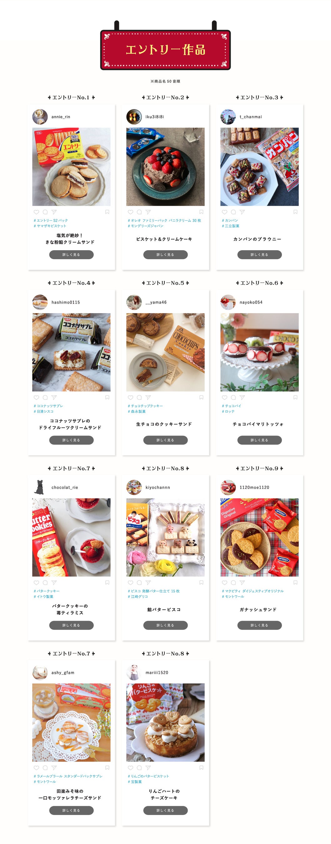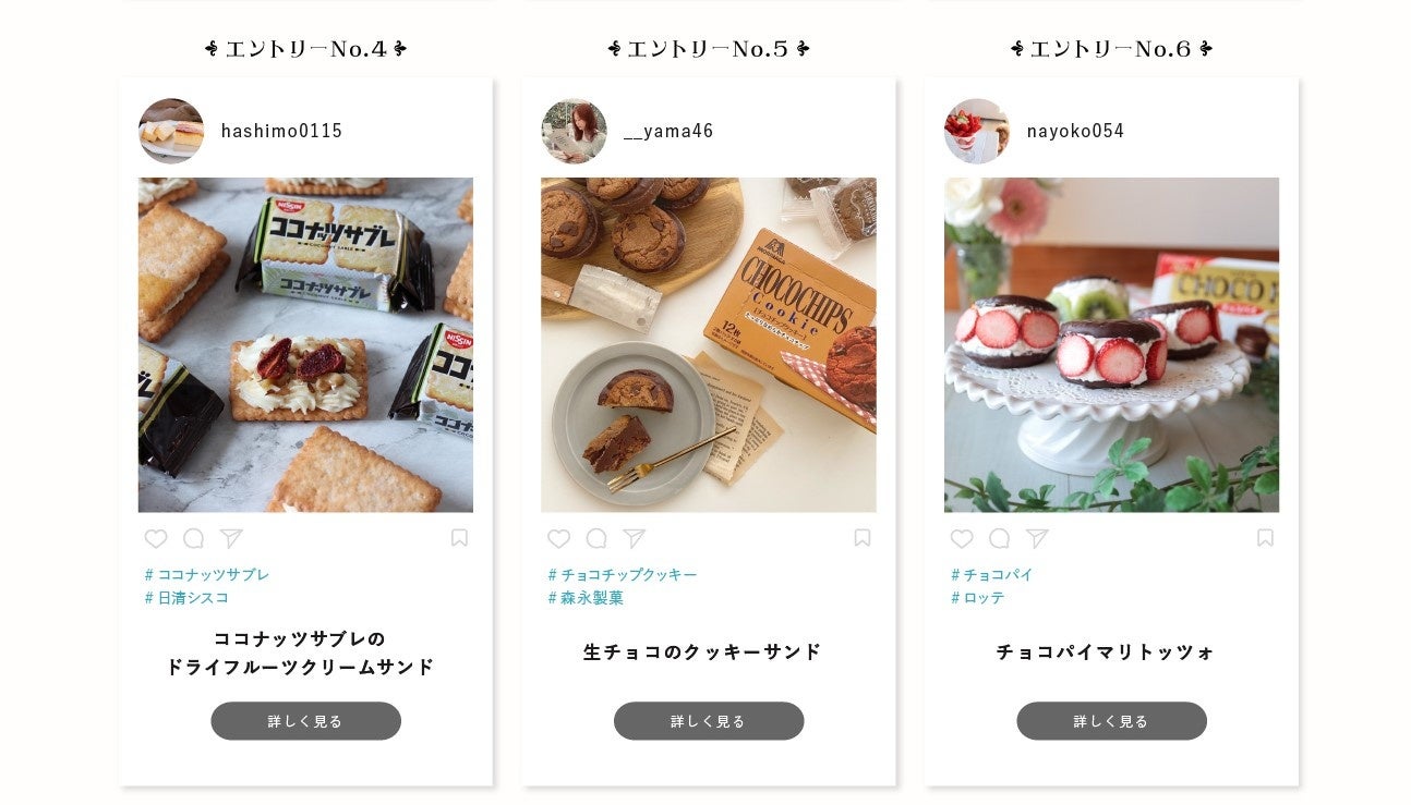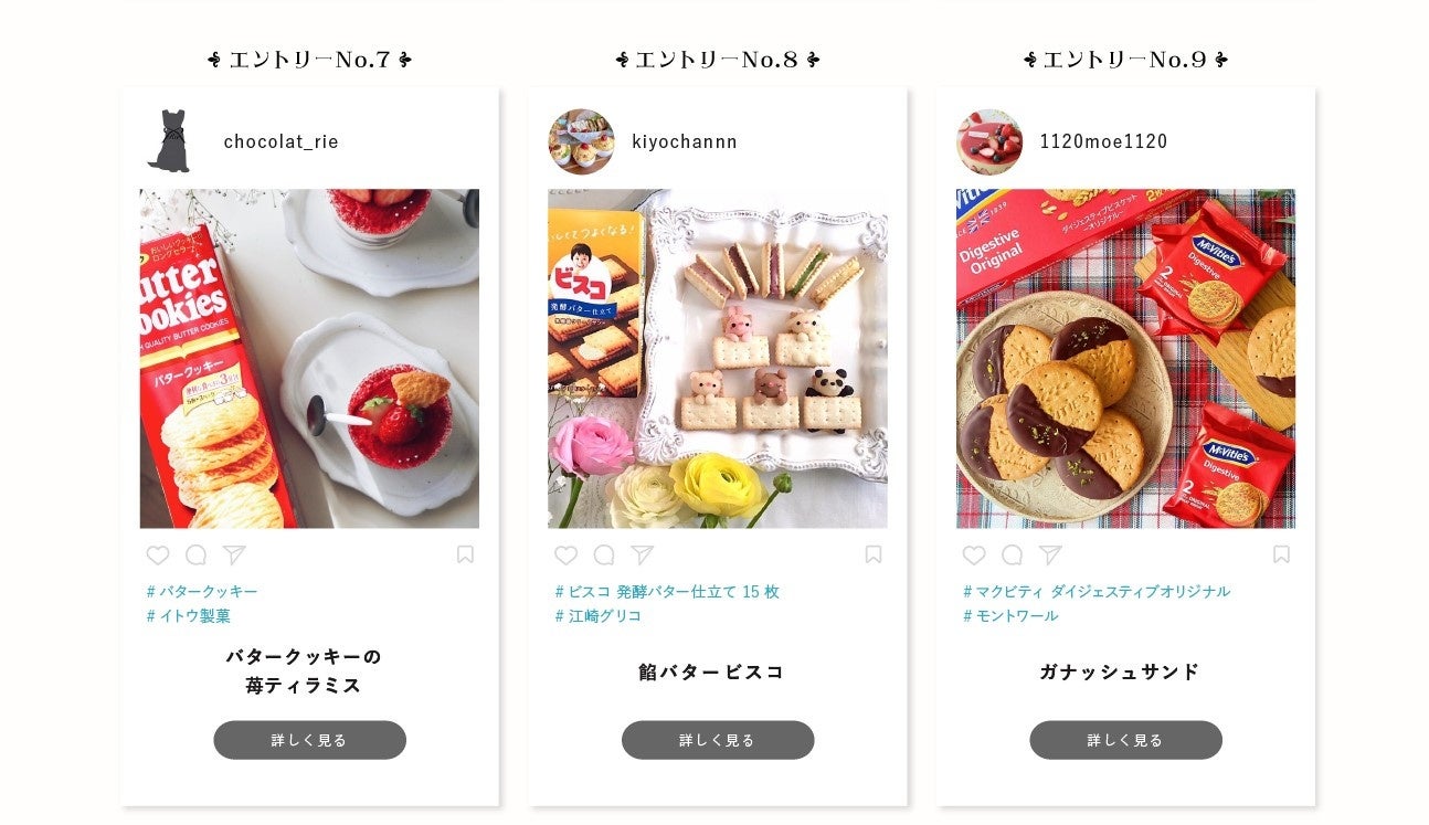 「第2回 ビスケットアカデミー賞」イベント特設HPでは2月25日(金)~3月21日(月)のイベント期間中、人気インスタグラマーが各メーカーのおすすめビスケットをおしゃれにアレンジした作品に投票できる投票イベントを開催します。HPには各エントリー作品のレシピも掲載されており、見て楽しい&作って美味しいどちらも楽しめるイベントです。