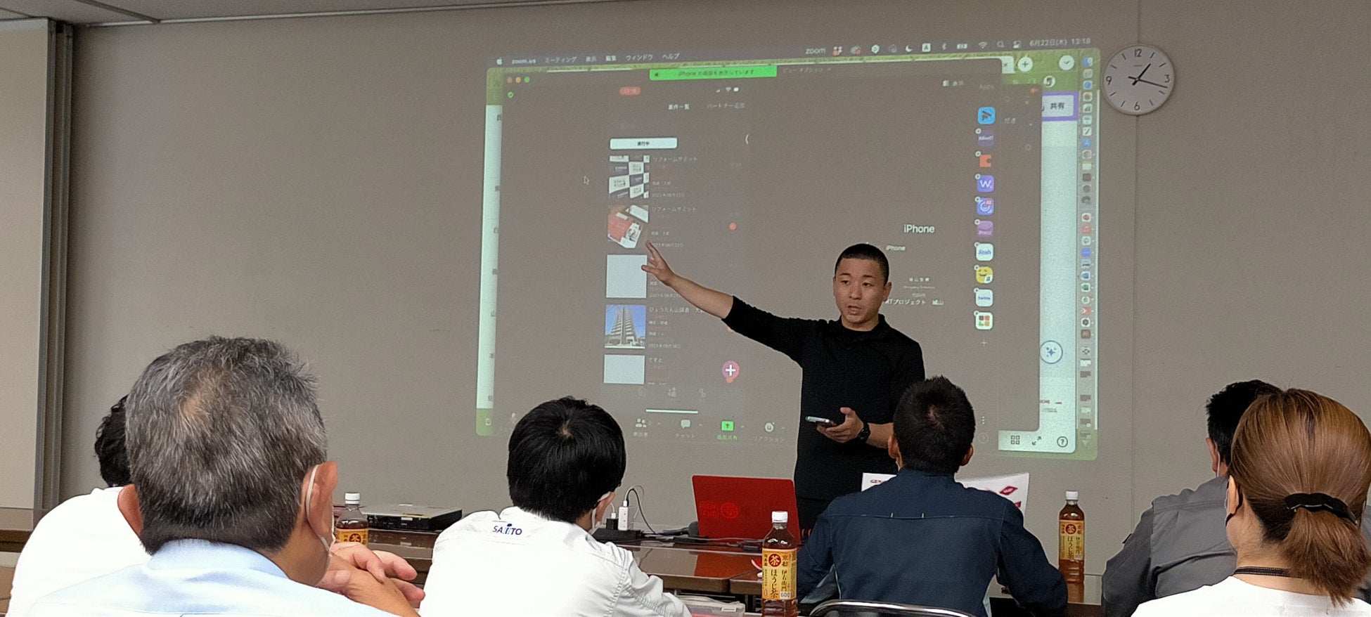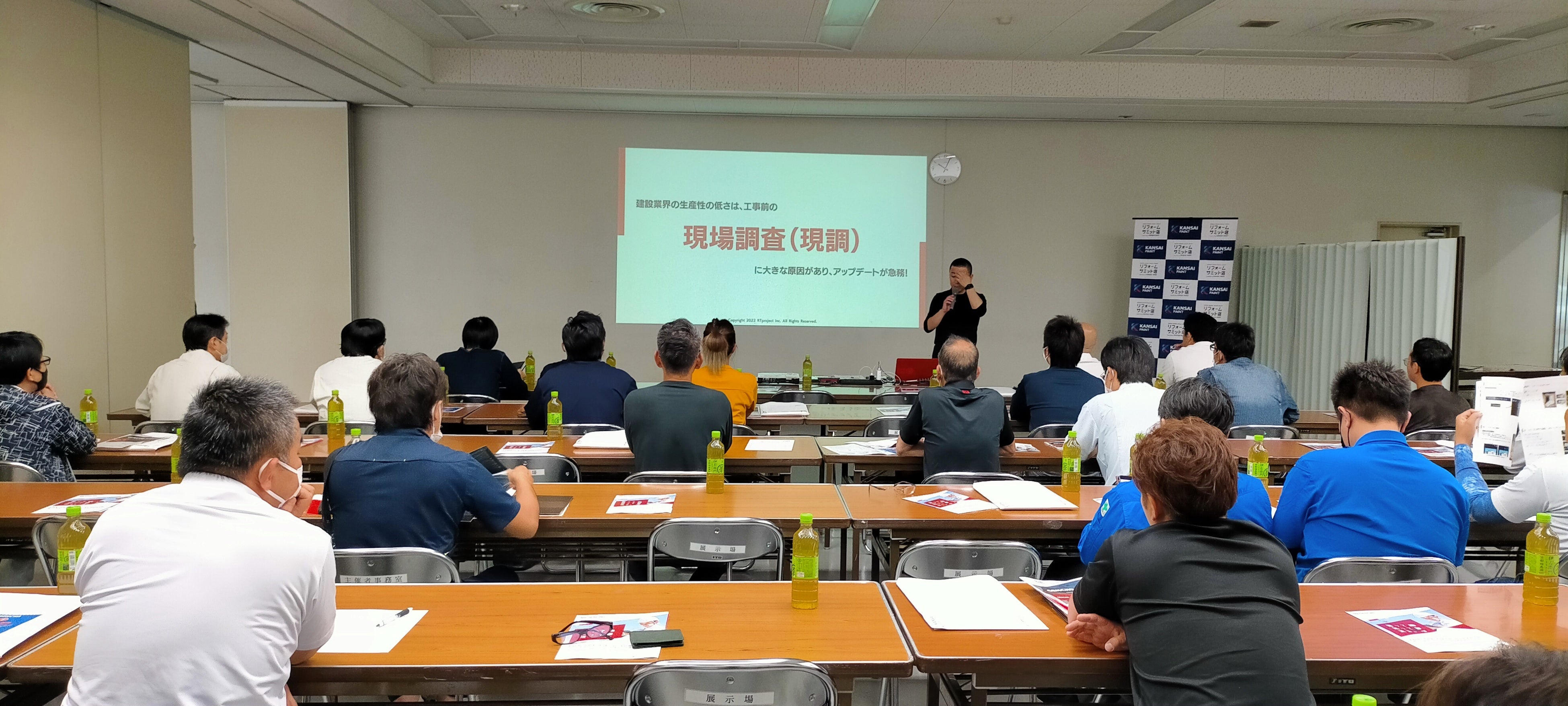 講義では、現場の作業効率あげ、残業時間の短縮化が出来る「GENCHO」の特徴や基本的な使用方法をスライドで説明するだけでなく、参加者には実際にアプリをダウンロードしていただき研修会場をお借りして実際にアプリを使用した現場調査を体験していただきました。