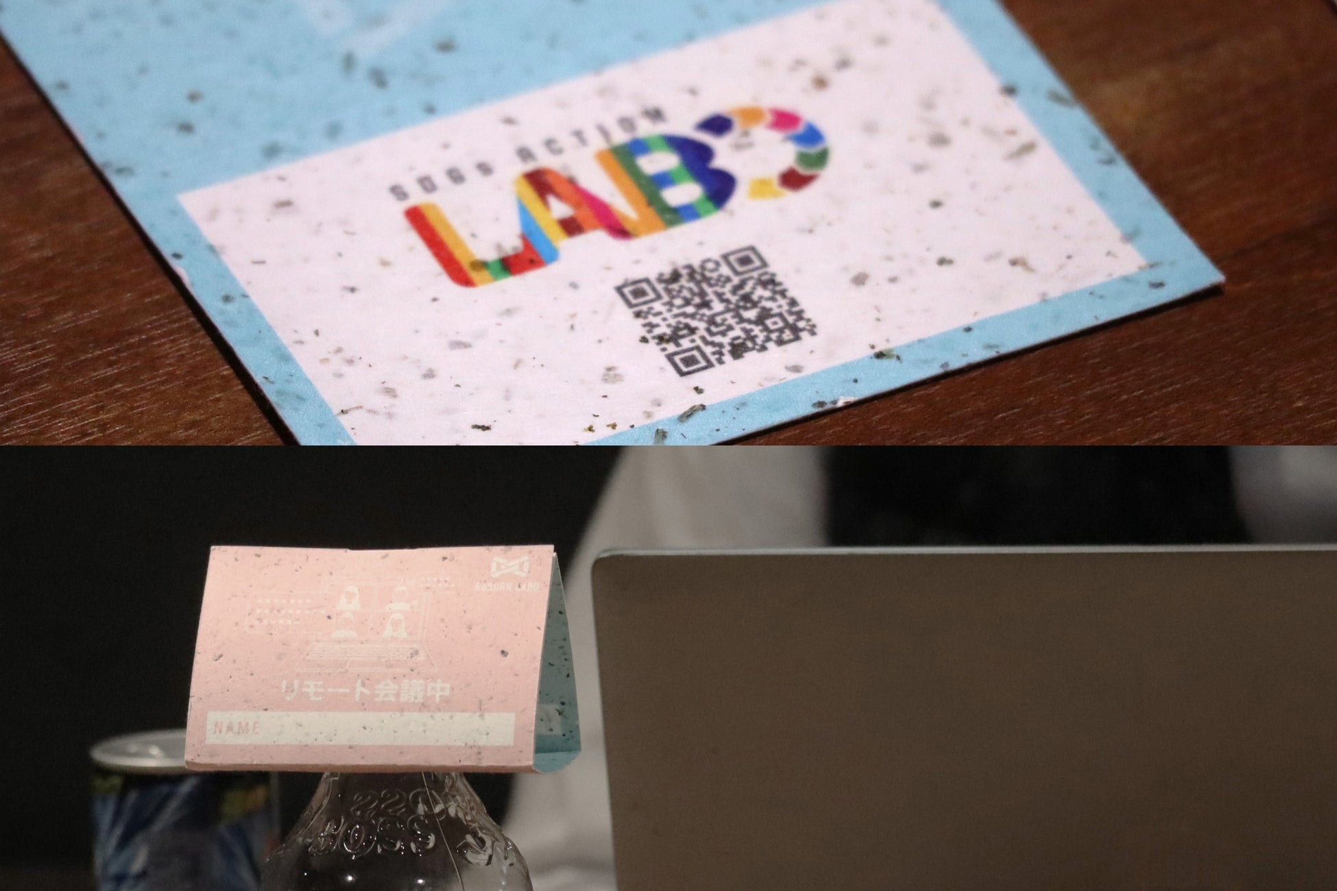 株式会社電通アドギアとせたがや農福ファーム・せたそらと共同で、せたがや農福ファーム・せたそらで廃棄される間引いたカブや大根を使い混抄紙をつくり、その混抄紙でリモート会議中か否かを表示するペットボトルに設置するPOPを製作しました。以下の写真は、その製作過程と完成品の一部です。
