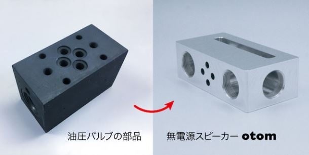 「otom」は油圧部品をヒントに開発。“油”の流れる方向を変える部品から、“音”の流れる方向を変えるスピーカーとして誕生しました。油圧部品製作では部品同士の組み立てまで行っていたので、自社商品にもその要素を取り入れました。お客様ご自身で部品を選んで組み立てるカスタマイズパーツを用意し、自分好みに育てて遊べるカスタムスピーカーとなっています。