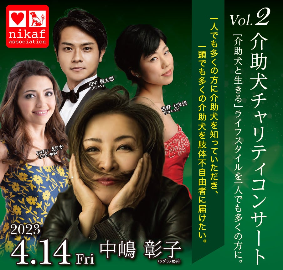 2022年12月に第1回目が開催され大好評だった「介助犬チャリティーコンサート」。2023年4月14日に第2回目が開催されます。今回もウィーンで活躍する世界的ソプラノ歌手の中嶋彰子さんを中心に本格的なオペラコンサートとなります。テーマは戦争と平和。「プロのオペラ歌手たちによるジャンルを超えた歌の数々」プログラム: ウィーン・ワルツ、チャップリン作曲「スマイル」、「I got Rhythem」「千の風になって」その他。皆様のお越しをお待ちしております。