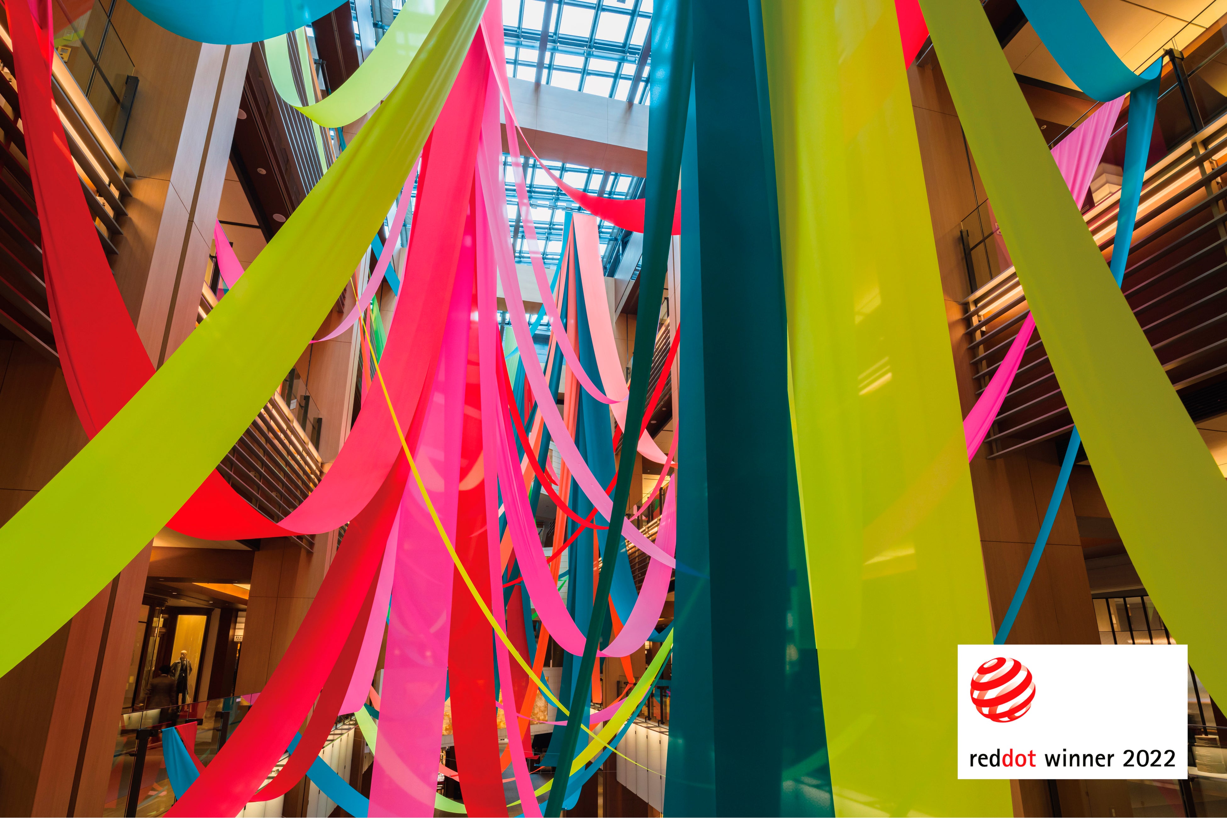 合計約8万㎥の吹き抜けの3つの空間に大きなリボンのような布を渡して、色のジャングルの様な景色が来場者を包み込みました。3階から地下1階まで様々に変わる眺めはまるで鳥の視線のようで、見る場所によって人の想像力が働き、森林や巨木、リボンやクラッカーなど、多様な印象を与えました。