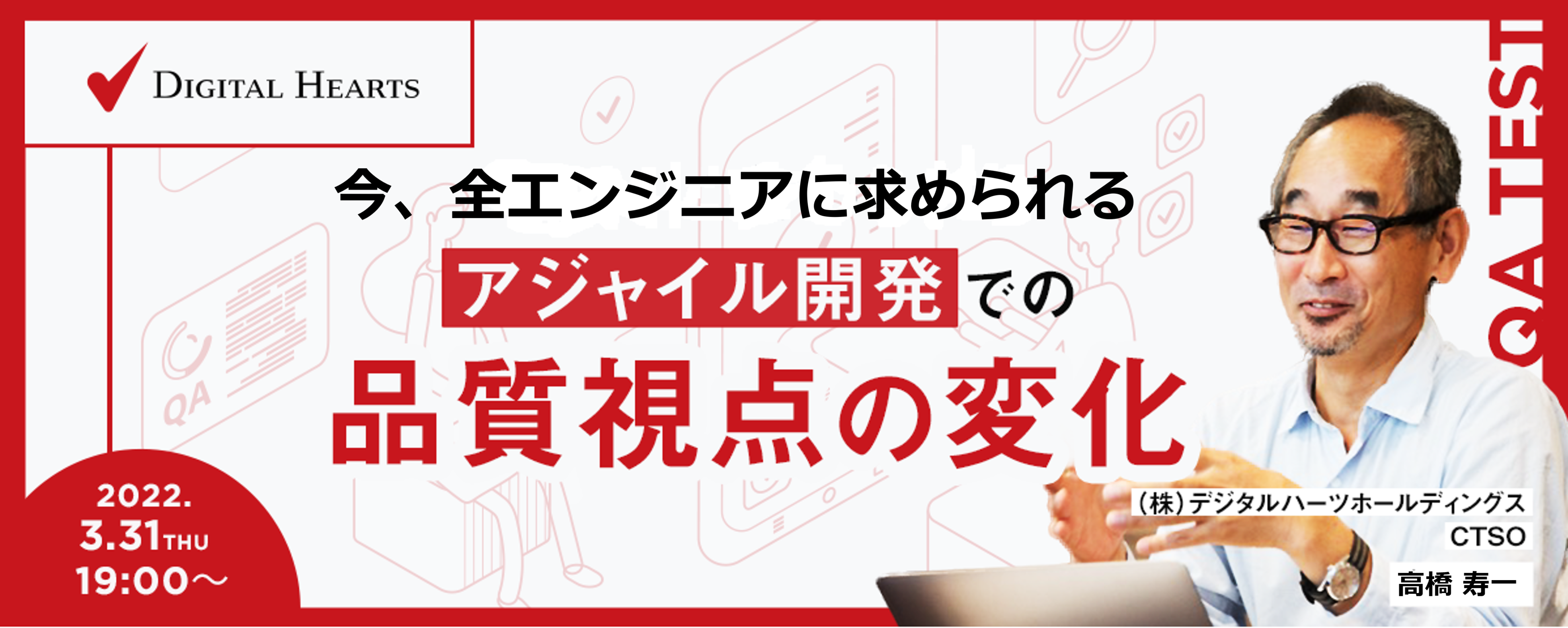 株式会社デジタルハーツ(本社:東京都新宿区、代表取締役社長: 二宮 康真、以下「デジタルハーツ」)は、ソフトウェアテストの第一人者で(株)デジタルハーツホールディングスCTSO(Chief Testing Solution Officer:最高テストソリューション責任者)の高橋寿一による、今後のアジャイルテストに関するオンライン特別講義を2022年3月31日(木)に無料開催することをお知らせいたします。