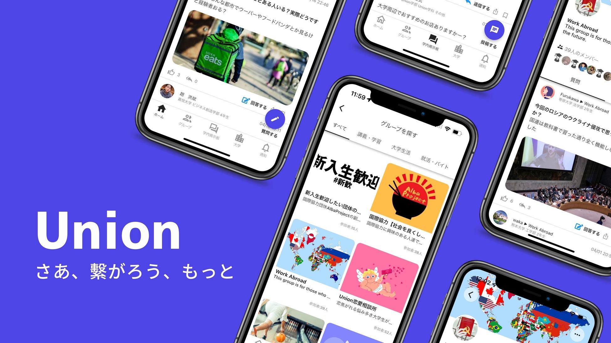 Unionは全国の大学生が日々の講義内容や就活、留学に関することを質問し、他のユーザーから回答を得ることができる機能。