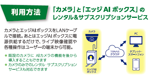テラスのレンタルは1日でも可能です。サブスクリプションは1年以上が基本で、1セットにつき月30万円(税別)から。カメラなど機器の使用料とクラウド・サーバの利用料が含まれています。