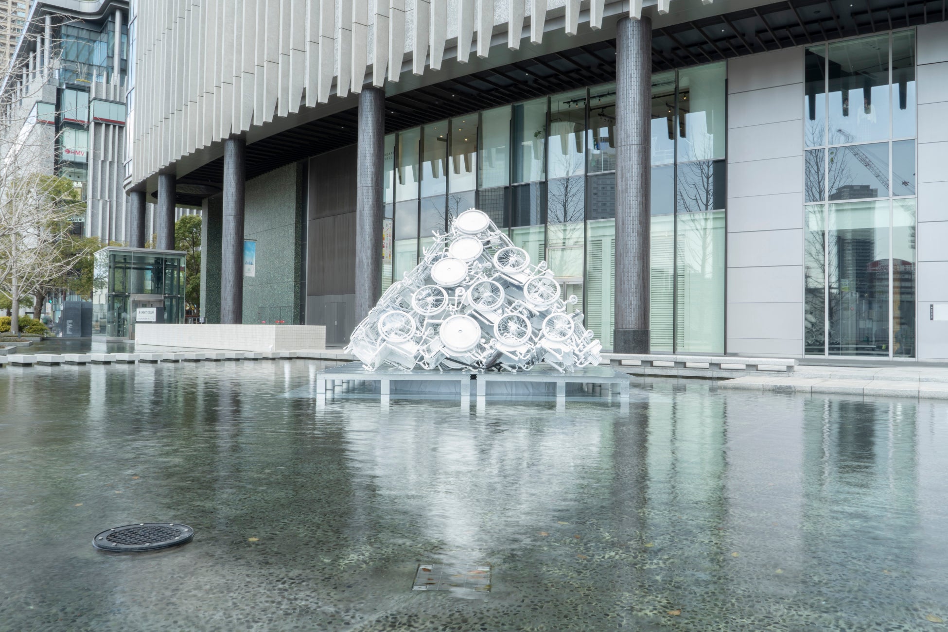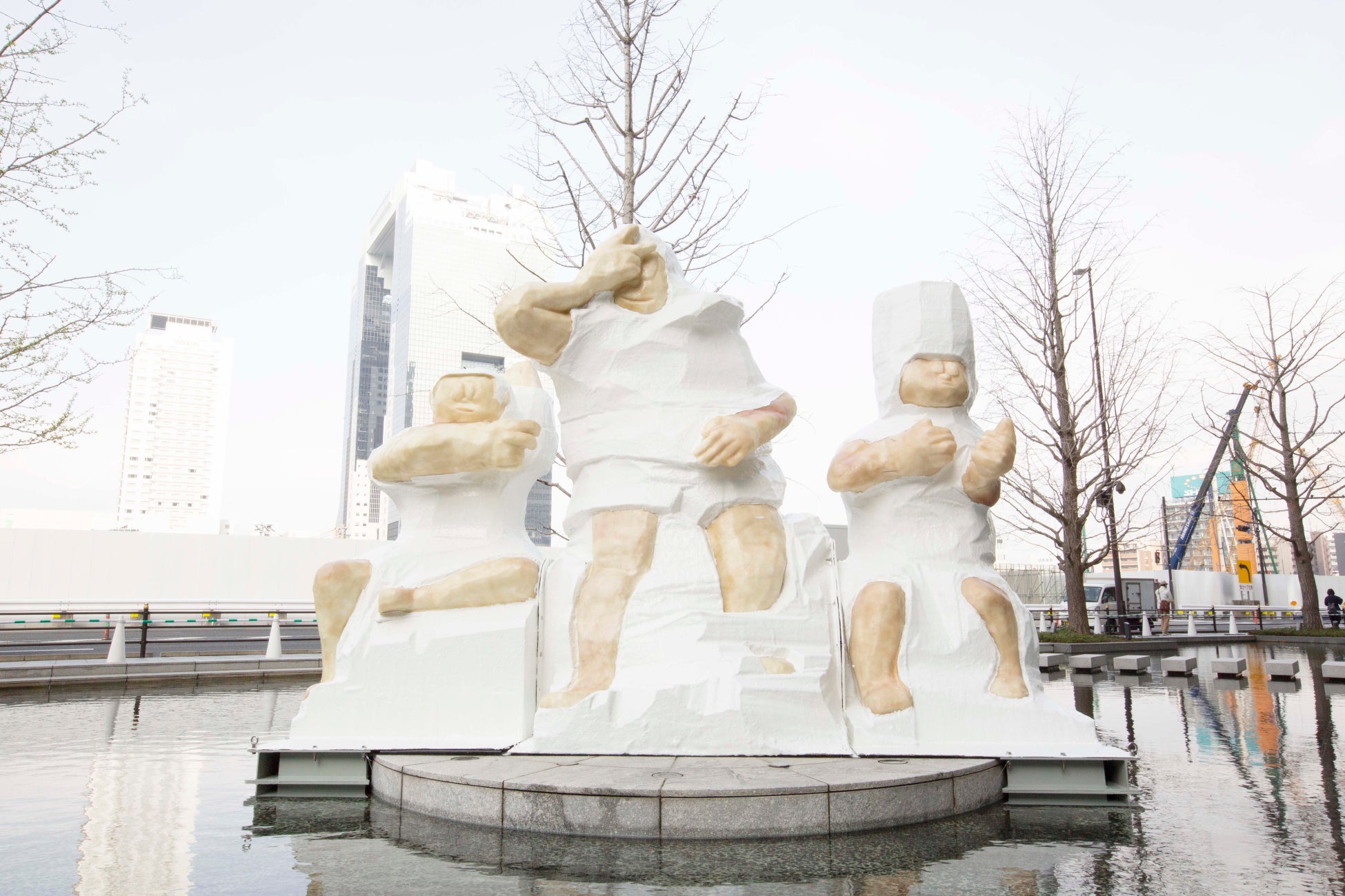 作品説明:「agarma(アガルマ)」はギリシャ語で「彫像」、そして「AGARUMAN」とは「人体彫刻」を意味します。本作は、自身の地元でもある大阪で展示するにあたって、大勢が行き交い、賑わいでいる人々から着想した3体からなる群像彫刻を制作しました。大阪の街ではしゃぐ3体の彫刻が、新型コロナウィルスが過ぎ去った明るい活気のある大阪の復興への願いが込められています。「Dear My Friend」。