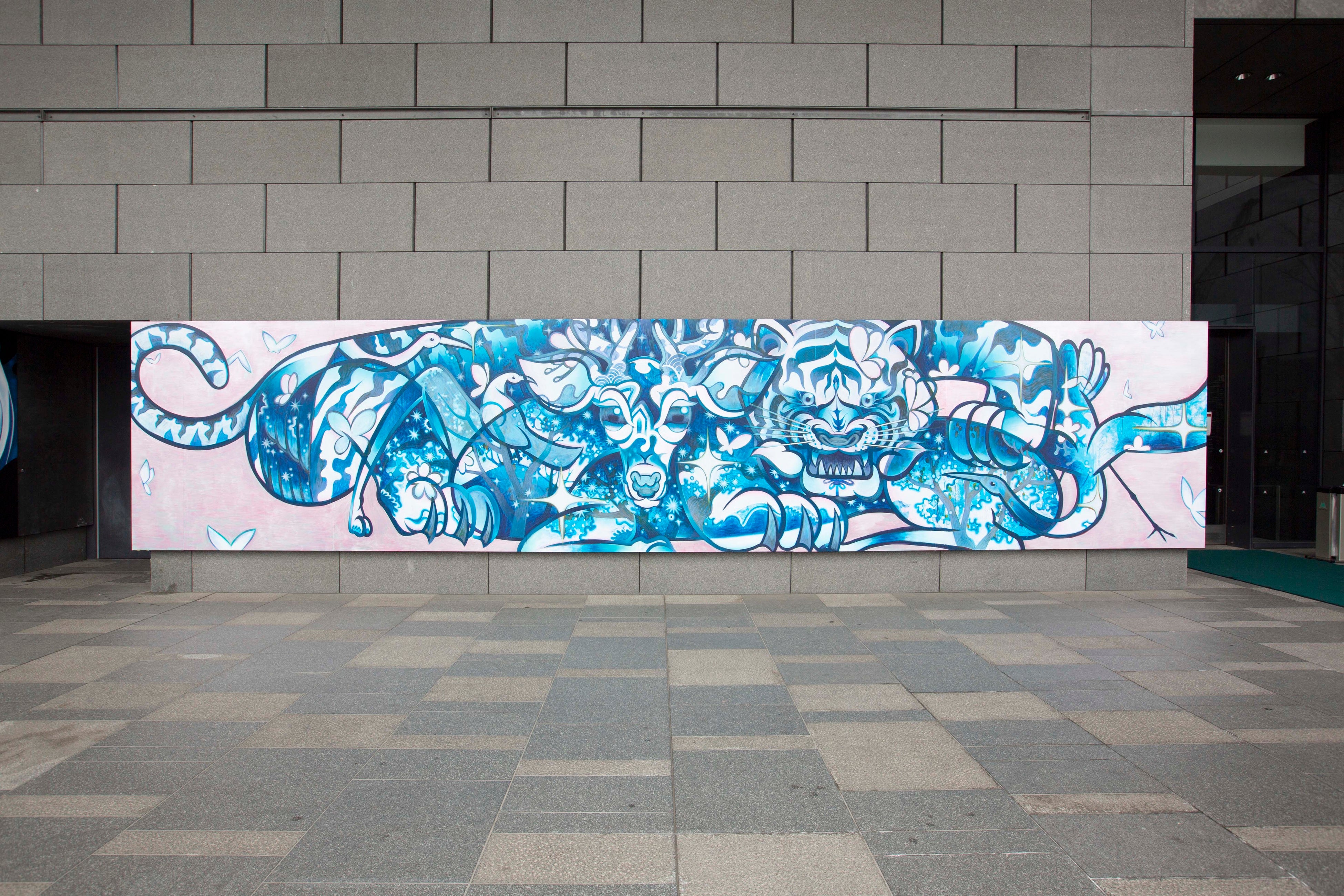 作品説明:コロナの猛威によって、あらためて私たちの経済圏は大自然の 中にあった事を強く思い知らされました。局地的に深刻な被害をもたらす地 震や津波、台風や火事よりも広範囲に、ウィルスは影響を与えます。飛行 機などの交通網が世界を覆う快適さに伴って、ウィルスはあらゆる都市に蔓 延できる可能性を手に入れたのでしょう。 自然の生態系を記号化したこのウォールアートは、動植物が自然環境と重 なり合って、一体となって、強かに生き抜く姿を示しています。微生物やウィ ルスを内包しながら、あらゆる生き物たちが関係し合った全体から、私たちが 学ぶことはとても沢山あります。 都市部にあっても、本当は自然の中にある私たちの生活が、こうした時代に 合わせて変化し、修正し、より良い世界に繋がっていきますように。