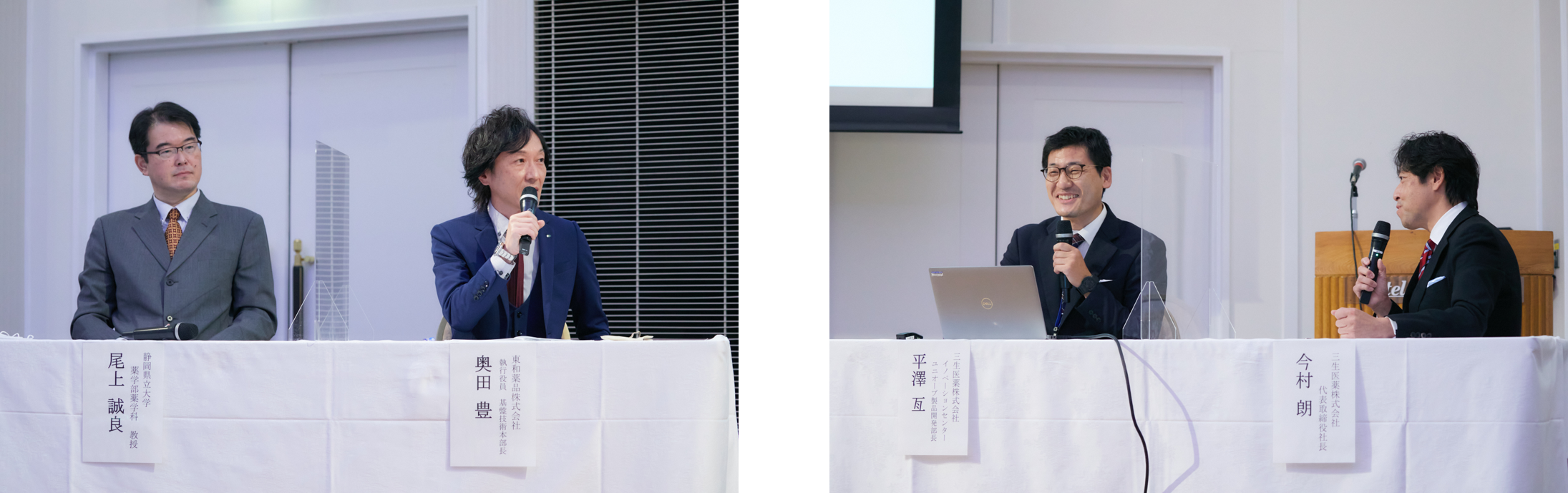 本発表会は、2部構成で行われ、第1部はイノベーションセンターにて、当社の常務取締役上席執行役員イノベーションセンター長の又平より、「イノベーションセンター」と「ユニオーブ®」に関する紹介と見学会を行いました。第2部では「ホテルグランド富士」にて、静岡県立大学の尾上教授による「ユニオーブ®への期待 医薬品の開発可能性を高めるゲームチェンジャー」の基調講演の後、イノベーションセンター ユニオーブ製品開発部長の平澤や、東和薬品で基盤技術本部長を務める奥田氏も含めて「ユニオーブ® 技術ができること~注射がなくなる日~」に関するトークセッションを行いました。