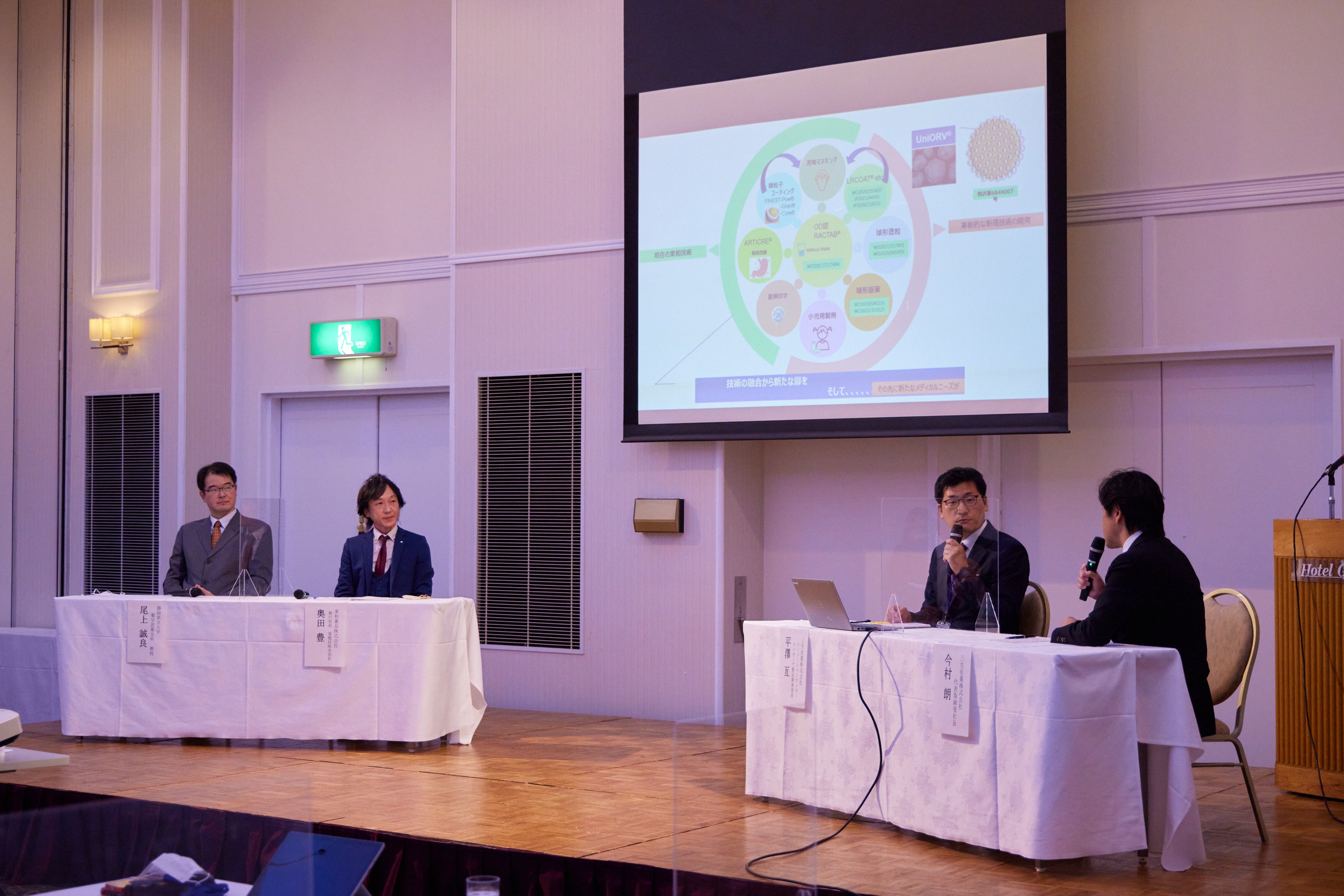 基調講演の後、当社社長 今村が進行役を務め、静岡県立大学薬学部 尾上教授、ユニオーブ製品開発部長でありユニオーブ ® 開発者の平澤、東和薬品で基盤技術本部長を務める奥田氏も含めて「ユニオーブ ® 技術ができること~注射がなくなる日~」をテーマとしたパネルディスカッションを行いました。ディスカッションの中では、ユニオーブが有望な経口製剤化手法であることが述べられ、将来的に注射のない世の中になる可能性も示唆しました。