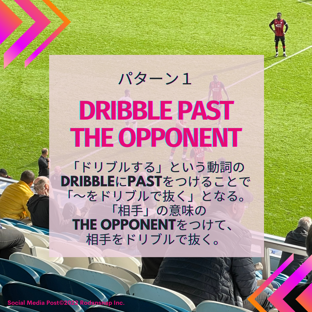 「ドリブルする」という動詞のdribbleにpastをつけることで「〜をドリブルで抜く」となる。「相手」の意味のthe opponentをつけて、相手をドリブルで抜く。