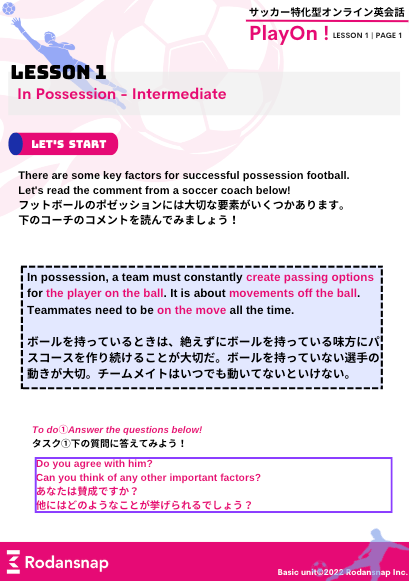英語でサッカーを話すための第一歩を踏み出したい方におすすめなコースです。サッカーのプレー中に使える基礎レベルのフレーズや、海外チームに入団した際に、自己紹介で使えるサッカーの表現を学ぶことができます。レッスンは先生がガイドしながら、フレーズの勉強やクイズ、サッカーに関するスモールトークを中心に構成されており、生徒が構えることなくカジュアルなスタンスで臨むことができるコースとなっています。