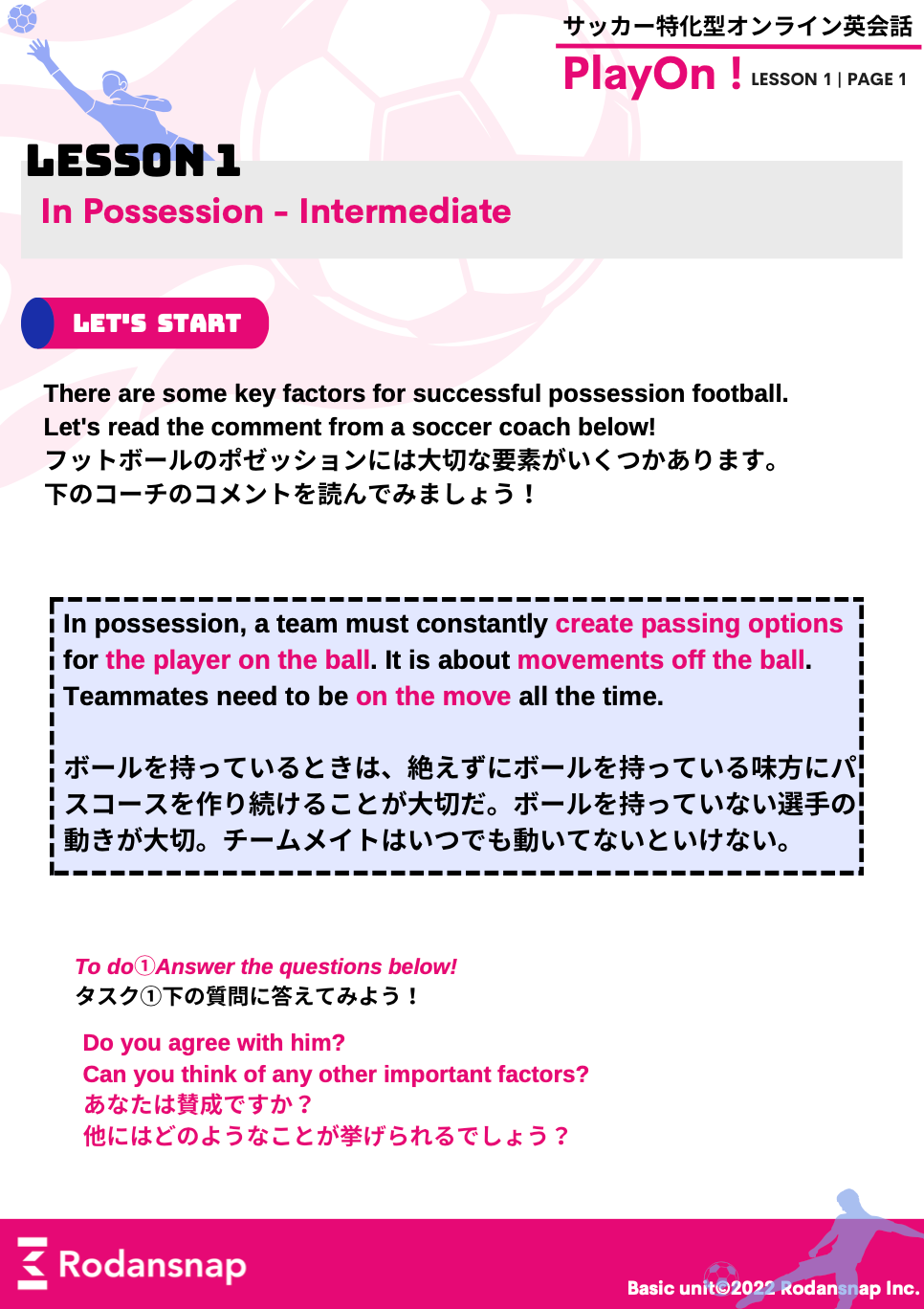 サッカー英語を学びたいけれどそれ以前に英語がほぼわからず不安だ...という生徒向けの教材です!この教材は、簡単な日常英会話にサッカー関連の話題を絡めて学習し、また、サッカーの現場で使用する基礎的なフレーズや単語をに触れ徐々に英語に慣れていただくことを目的としています。