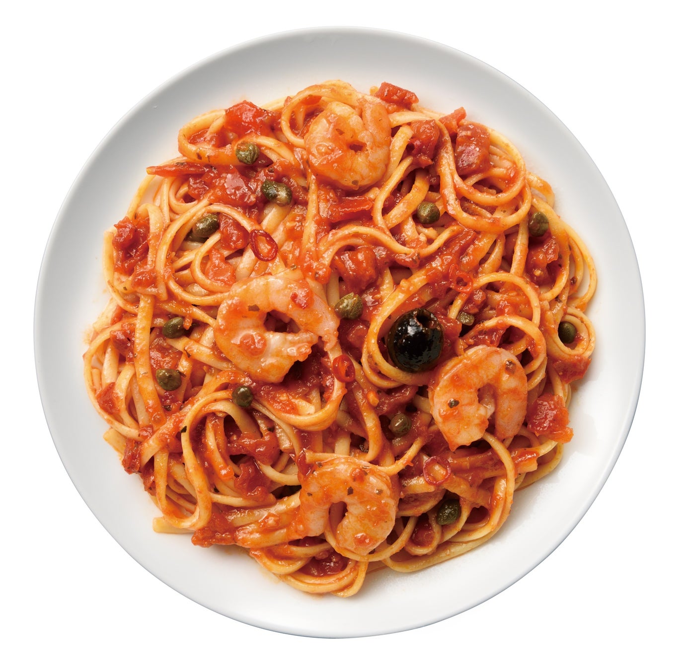 イタリア中部、ローマを擁するラツィオ州やイタリア南部、ナポリを擁するカンパーニャ州が発祥とされているトマトベースのシーフードパスタです。パスタはソースがよく絡み合うよう、断面が楕円形で平たい形状をしたパスタ「リングイネ」を使用しました。ソースは、トマトの酸味にケッパーとアンチョビ、オリーブの塩味が新鮮なエビと絡み合うよう、大人の味に仕上げました。
