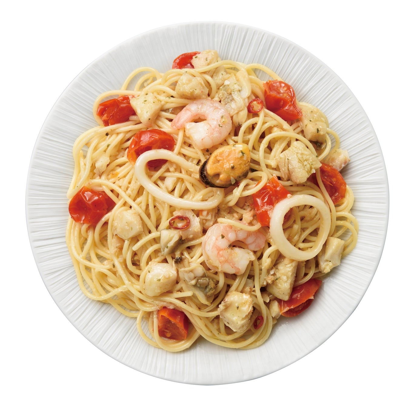 カンパーニャ州発祥と言われているパスタ料理です。5種の魚介類の旨みに、トマトを加え、にんにくがきいたオリーブオイルのソースで彩りと食べ応えのあるパスタに仕上げました。別添えのシチリア島の岩塩で好みの味に調整いただけます。