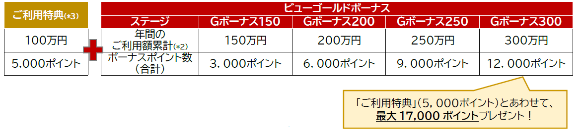 (*2)「ビューゴールドボーナス」は4月~翌年3月にお届けするご利用代金明細書(3月~翌年2月末までのご利用分)のご利用額累計