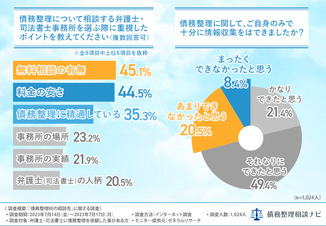 「債務整理について相談する弁護士・司法書士事務所を選ぶ際に重視したポイントを教えてください(複数回答可)」と質問したところ、『無料相談の有無(45.1%)』と回答した方が最も多く、次いで『料金の安さ(44.5%)』『債務整理に精通している(35.3%)』『事務所の場所(23.2%) 』『事務所の実績(21.9%)』と続きました。
