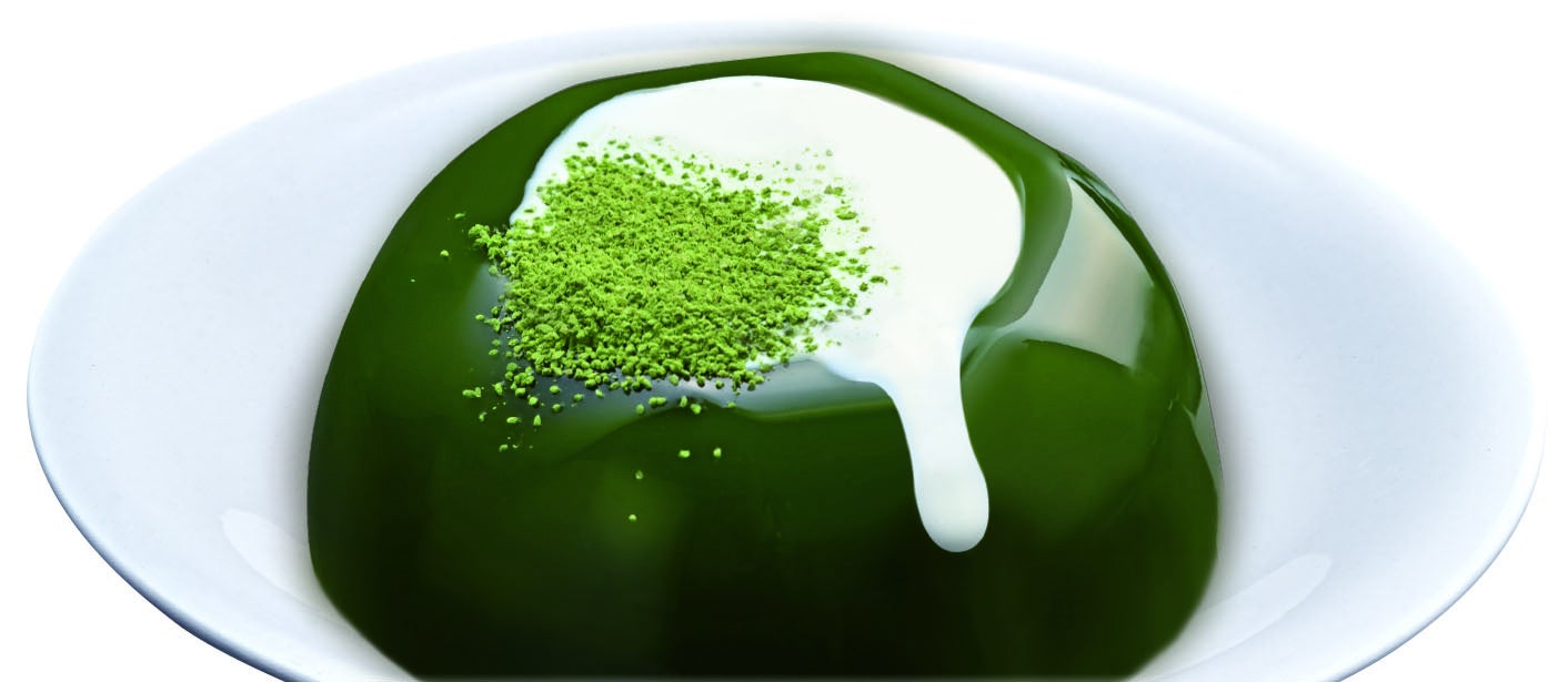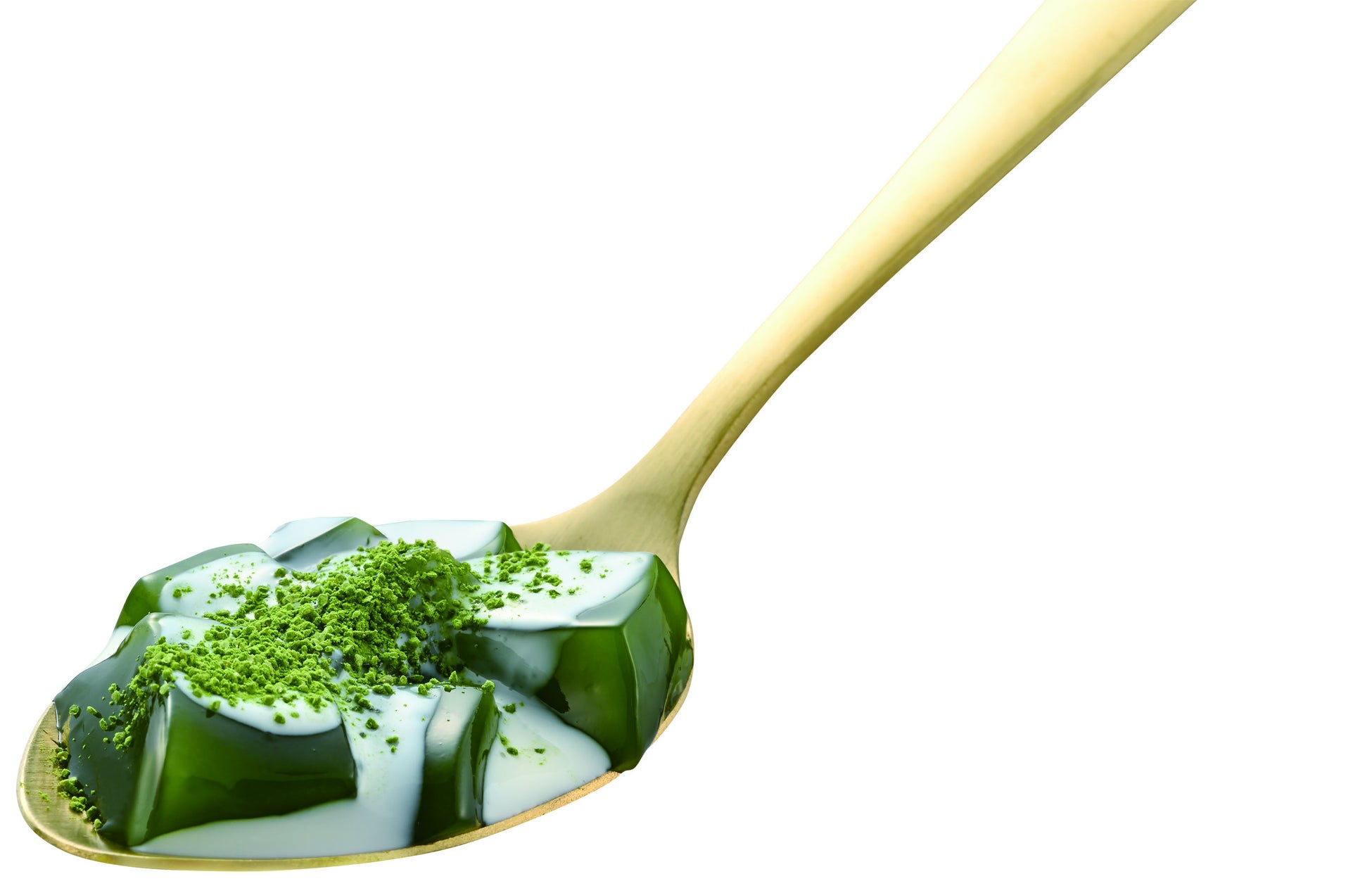 ゼリーに特製抹茶シュガーをかけて、おい抹茶に。フレッシュをかけてミルク抹茶にして味の変化をお楽しみください。