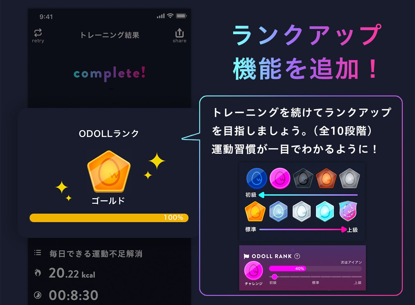 いつかは欲しかった「運動習慣」を手に入れられる!?フィットネスアプリODOLLにランク機能を追加!