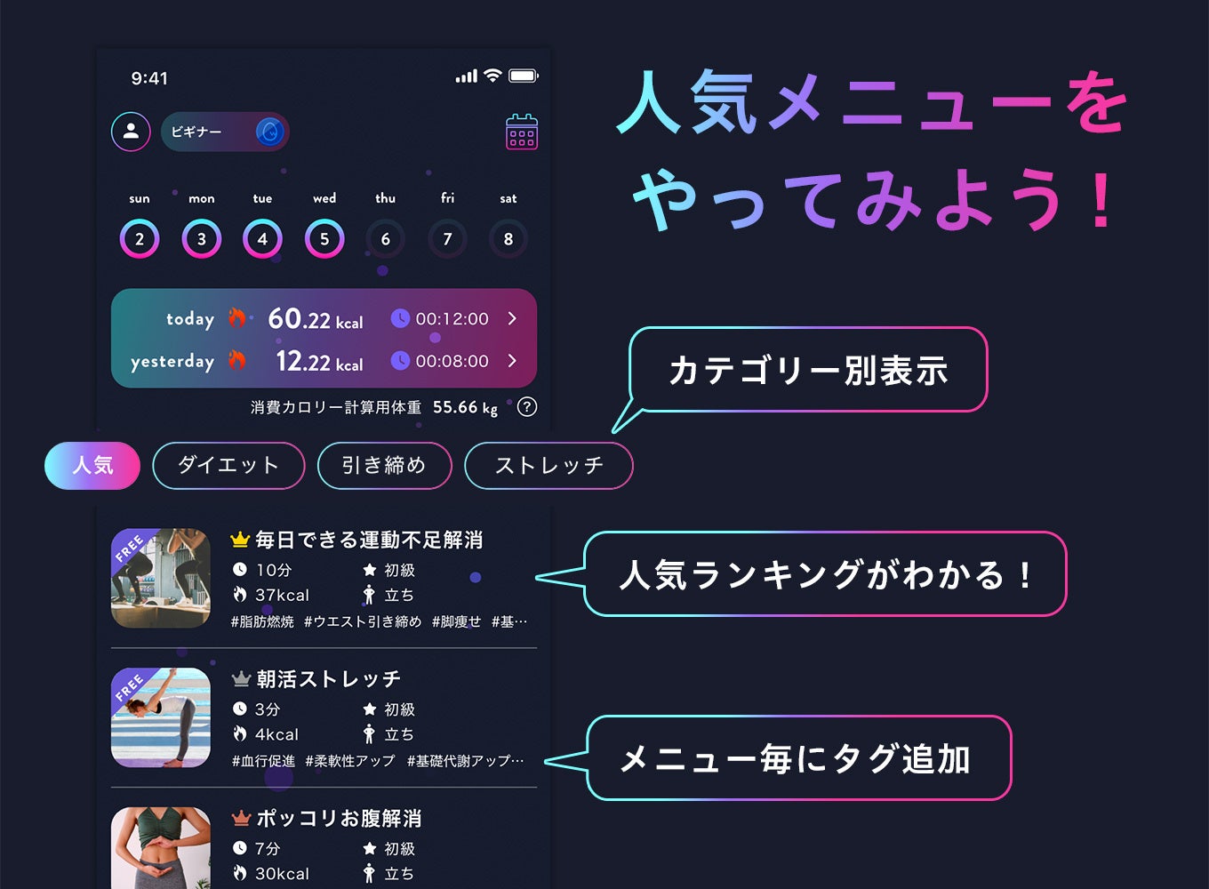 汗を流して頑張りたい時はダイエットメニューを、疲れていたり筋肉痛の日はストレッチをしてみたり!デスクワークで肩こりや腰痛が気になる時には、椅子に座ったままできるトレーニングをしてみるなど、体調や気分に合わせてトレーニングを簡単に選ぶことができます。