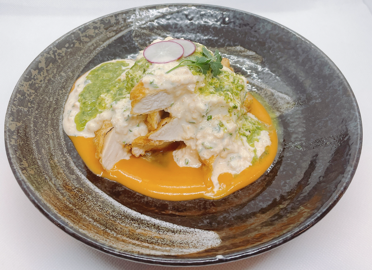 1周年のお祭りで王道の型を破り、オーロラソースで召し上がっていただくチキン南蛮を考えました。特製オーロラソースはロブスターやオマール海老などの魚介から出汁をとったビスク(フレンチの代表的なスープ)風の味付けにしています。