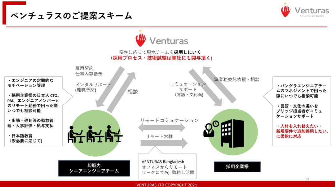 バングラデシュ人ITエンジニアと日本企業との人材マッチング事業を行う、株式会社VENTURAS(ベンチュラス)(本社;東京都渋谷区、代表取締役:上田代里子)は、エンジニア海外リモート雇用サービスを2021年5月6日にリリース致しました。本サービスは、プロダクト開発のKPIを磨くスピードが大命題で、採用PDCAに間接コストをかける余裕のないスタートアップ企業に向け、海外リモートで働く即戦力フルスタックエンジニアチームを提供します。