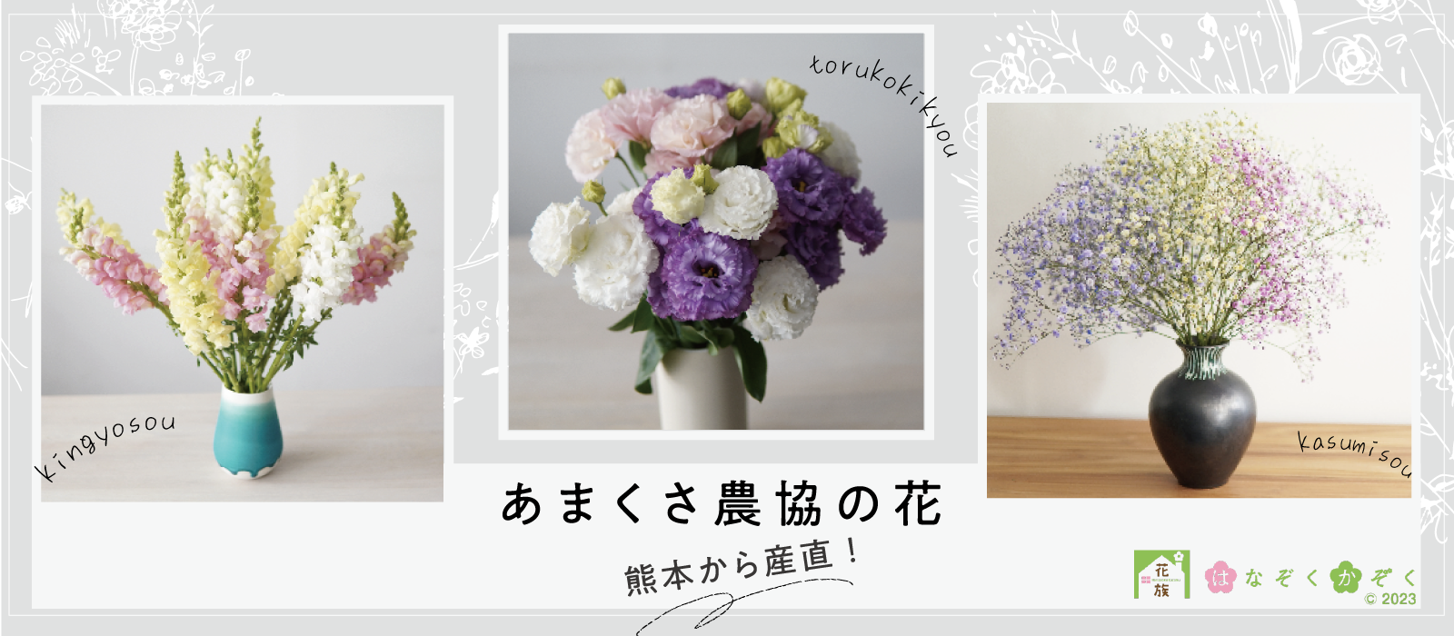 花の農家直送セレクトショップ「はなぞくかぞく」(兼弥産業株式会社、本社:愛知県南知多町、代表取締役:青山松夫)は、JAグループ熊本の【あまくさ農協】と主力生産品である「かすみ草、トルコキキョウ、金魚草」の販売でコラボレーションします。