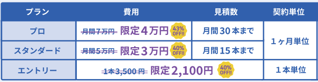 今月からより多くのお客様にご利用頂けるよう今月からは初月無料のキャンペーンも開始致します。繁忙期の人手不足対策としてぜひご検討ください!通常料金は月額固定費プランと1本単位でご利用可能なエントリープランをご用意。リリース記念として最大43%OFFでご利用いただけるキャンペーンも実施しております。
