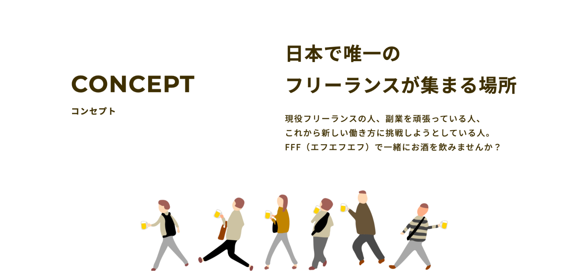 FFFとは「The first bar for freelancers」の略で、フリーランスが集まる唯一のバーであることを意味します。現役フリーランスの人、副業を頑張っている人、経営者、これから新しい働き方に挑戦しようとしている人など多様な働き方の人が集まり、普段は話せない人たちとの交流ができる場を提供します。お酒を飲みながら交流することで、「情報交換」「お仕事の受注」「仕事への刺激」につながれば幸いです。