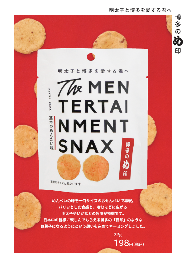 パリッとした食感と、噛むほどに味わえる明太子やイカなどの旨味が特徴です。商品名は、メンターテインメントスナック(明太子+エンターテインメント)として福岡・博多から全国へ発信する、日本中の皆様に楽しんでもらえる博多の「目印」なお菓子という意味をこめてネーミングしました。