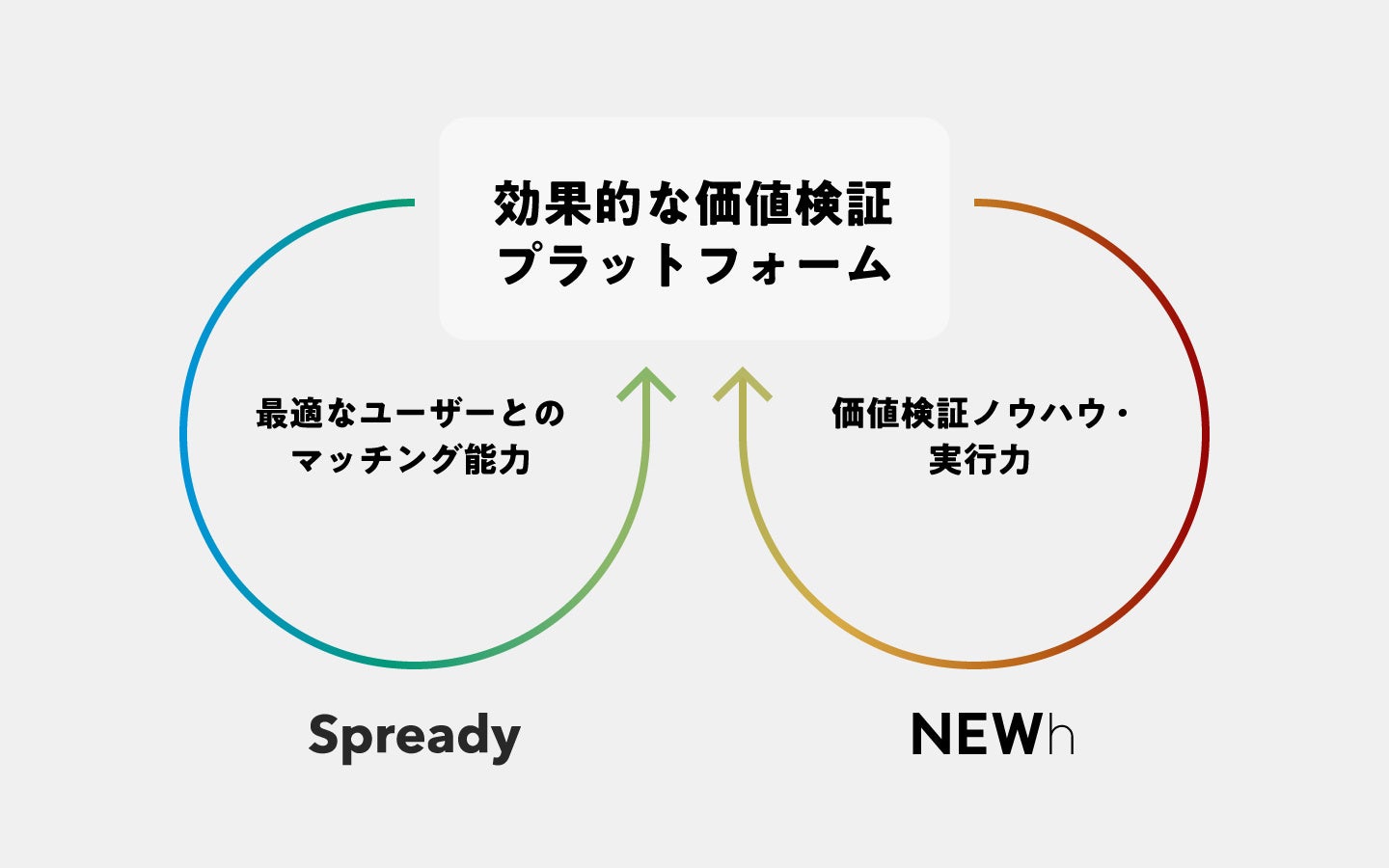 こうした背景から、Spready社とNEWhの強みを掛け合わせ、課題仮説検証、ソリューション仮説検証、体験仮説検証など価値検証タイミングにおいて「最適ユーザーとのマッチング力」と「効果的な価値検証のノウハウ・実行力」を組み合わせることで、スピーディーでより確かな検証を可能にします。
