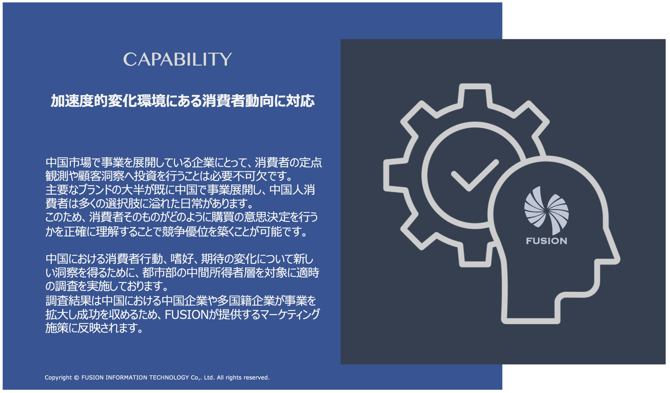 FUSIONは、中小企業庁「JAPANブランド支援等事業」の支援パートナーの採択を受け、中華圏へ向けた展開を検討する企業様を始め、市場を知る上での調査、既存展開の拡大化やブランド活動領域拡大化による基盤調整など、リスクの観点による“現状留保”されている企業様にとっては、一歩先へ進みやすい支援と考えております。
