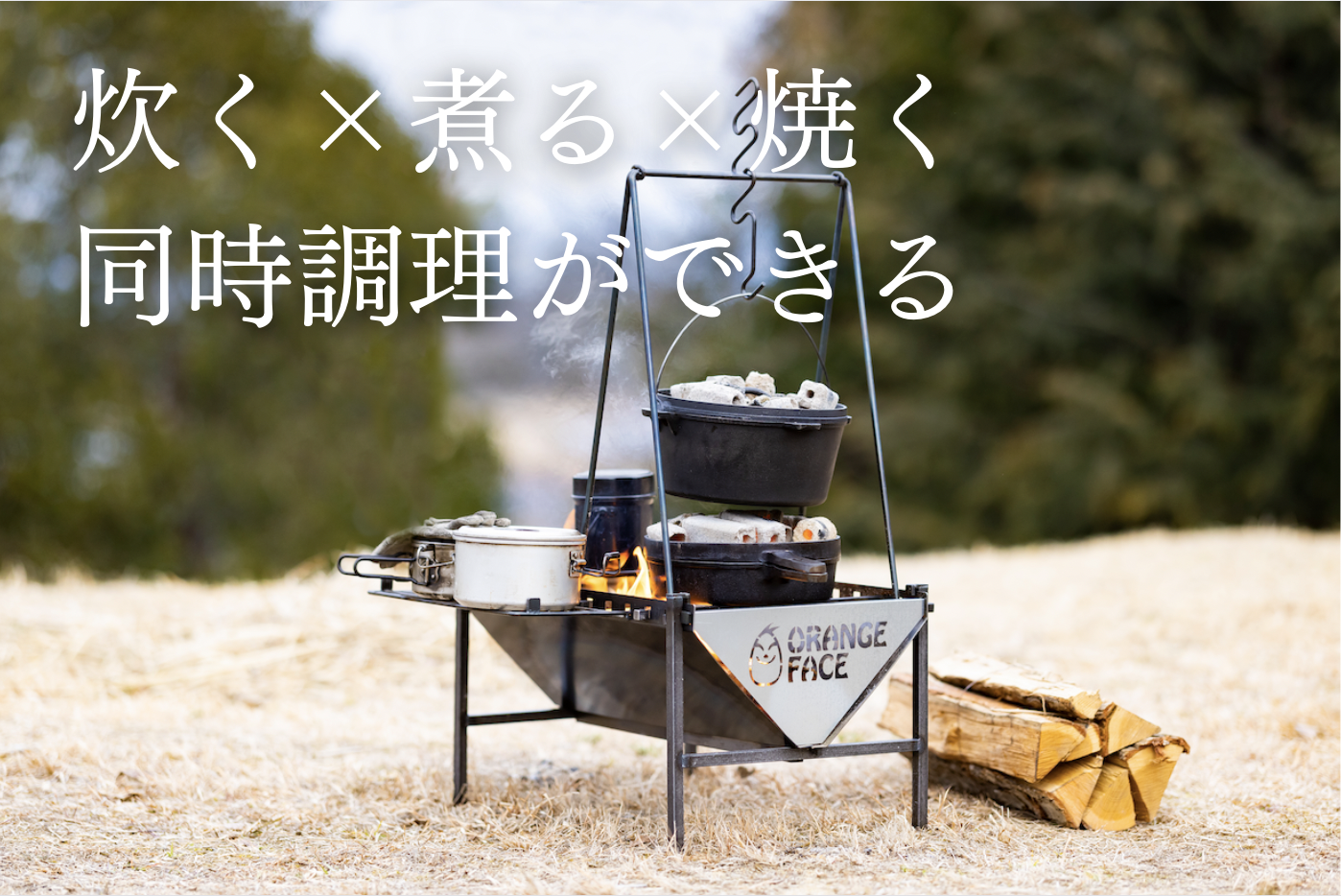 【ORANGE FACE】の焚き火キッチンは、ご飯を炊く、シチューを煮る、お肉やお魚を焼くなど同時に3つの調理を1台ですることで多機能キッチンのような使い方が可能になります。