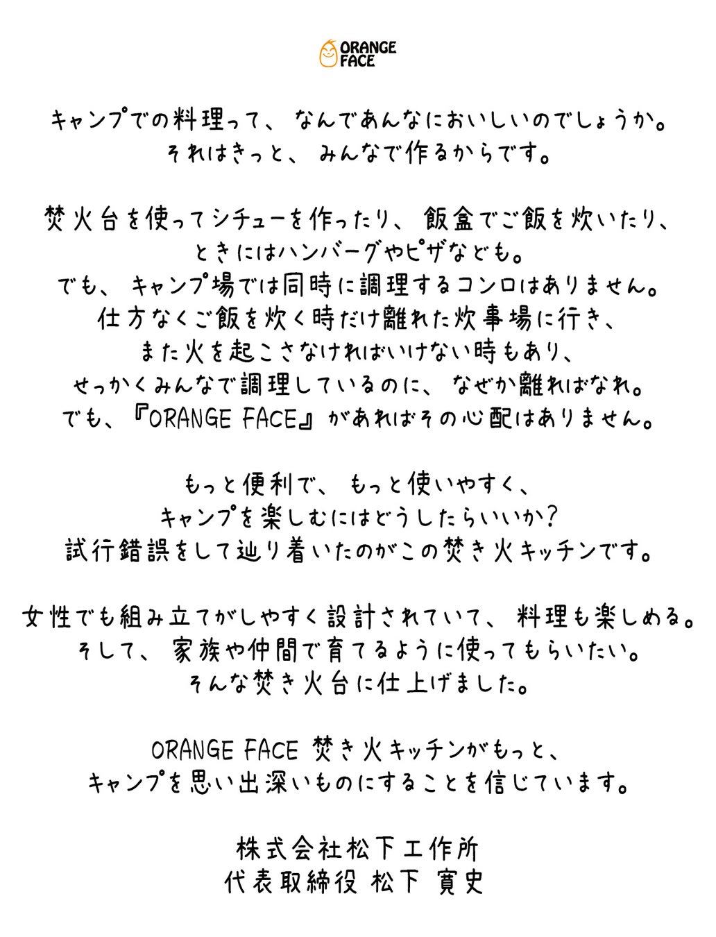 夜のキャンプ場で焚き火を囲む家族や仲間の顔が「ポッとオレンジ色に映る」そこからORANGE FACEと名付けました。