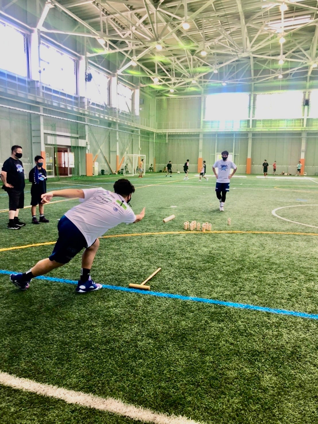 ニュースポーツ交流会と題して、モルックと3x3を所属選手と共に地域の子どもから大人まで競技や交流を楽しんだ。モルックは初体験という方がほとんどだったが、選手と共にルールを覚えながら会場は笑顔で溢れていた。