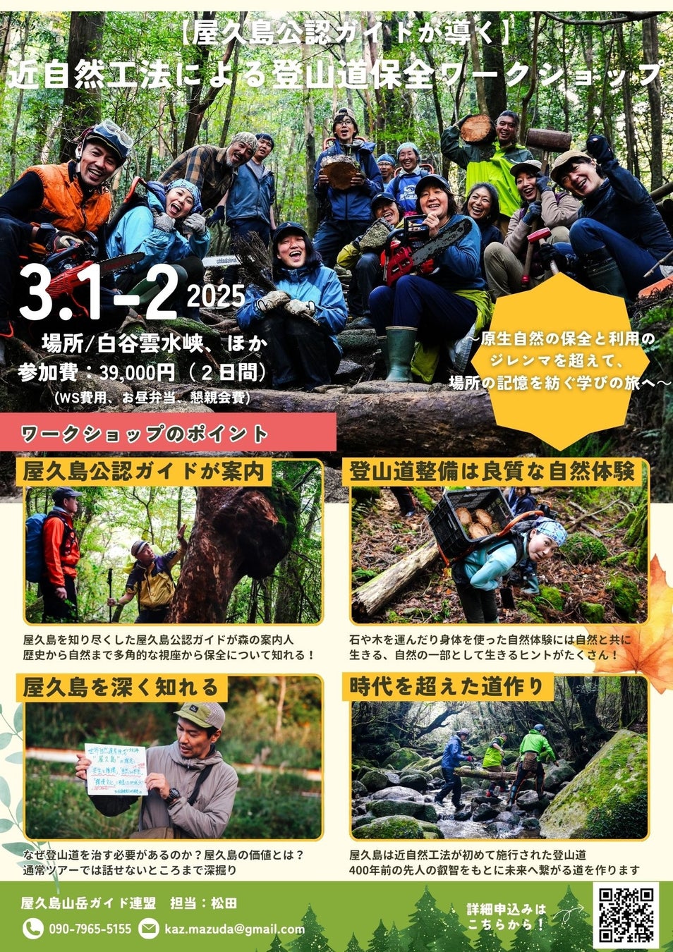 2025年3月1日(土)~2日(日)にかけて、サンカラ基金を活用した「屋久島公認ガイドが導く、近自然工法による登山道保全ワークショップ」(主催:屋久島山岳ガイド連盟)を実施いたします。