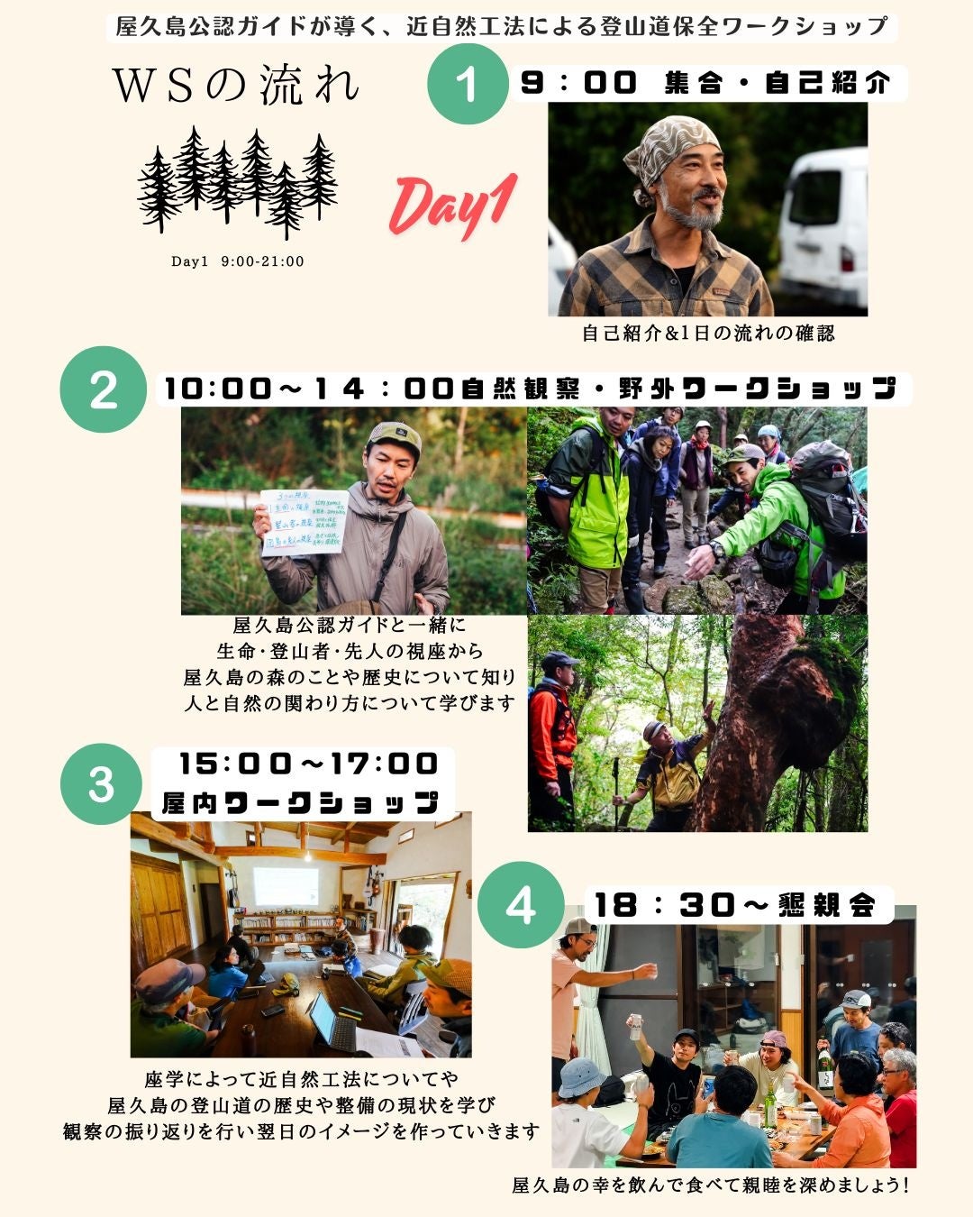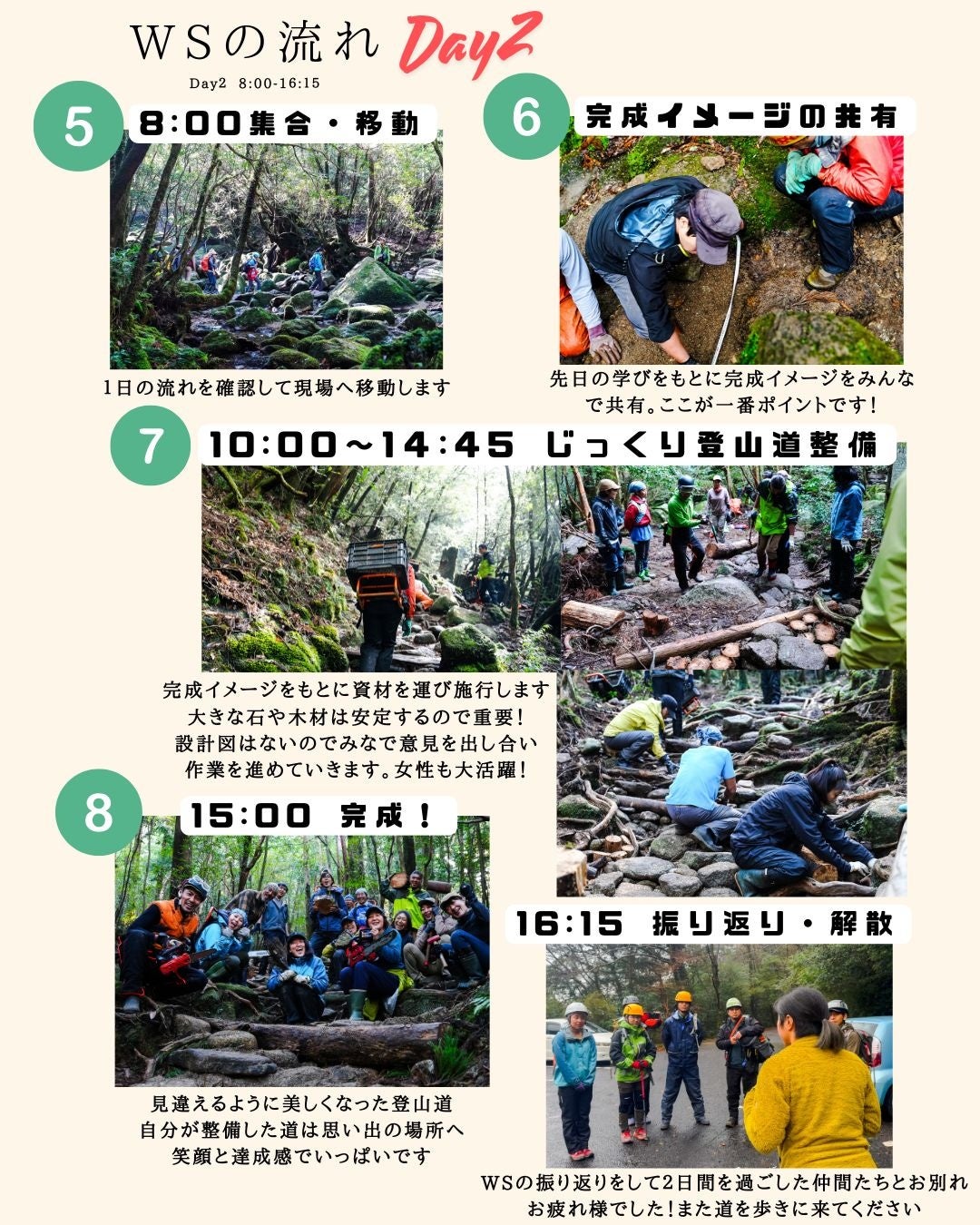 今年度の登山道整備は、登山道や生態系保全に関心のある一般の方でも参加できる体験型ワークショップとして実施いたします。屋久島を知り尽くした屋久島公認ガイド案内のもと、道づくりを通して屋久島をより深く体感できる貴重な企画となっています。